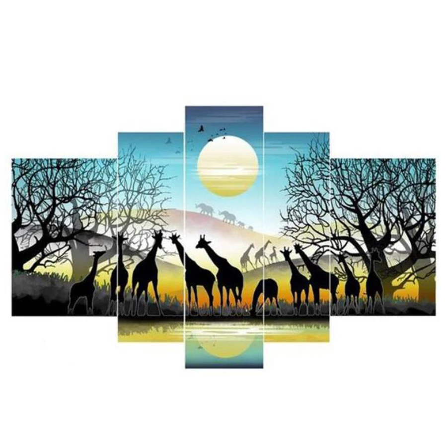 Алмазная 5D картина с несколькими панелями, жираф, слон, Африка, луг, картина, алмазная вышивка, набор из 5 предметов, мозаика-пазл с пейзажем