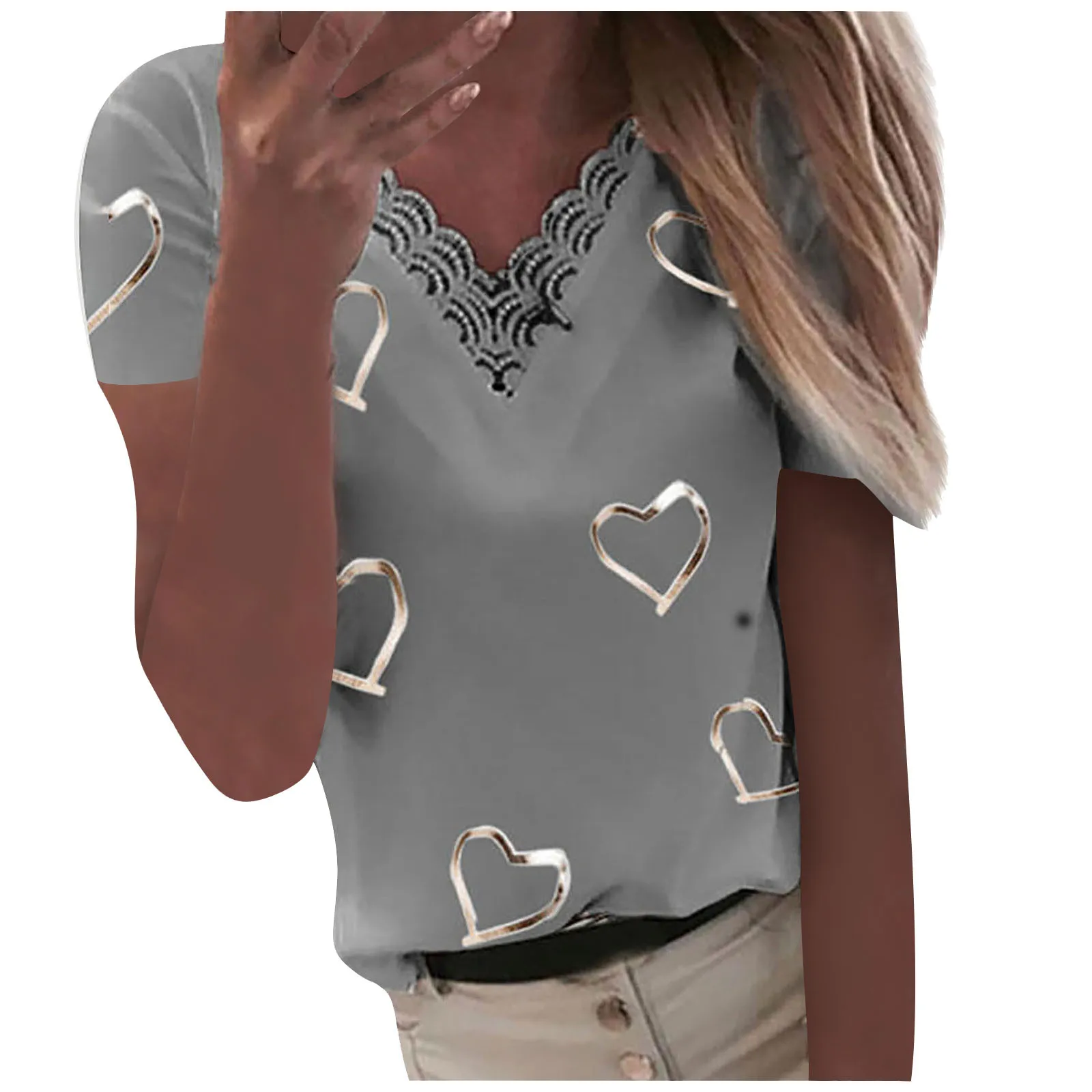 Женская кружевная Лоскутная футболка с коротким рукавом с принтом сердец и v-образным вырезом, пуловер, блузка