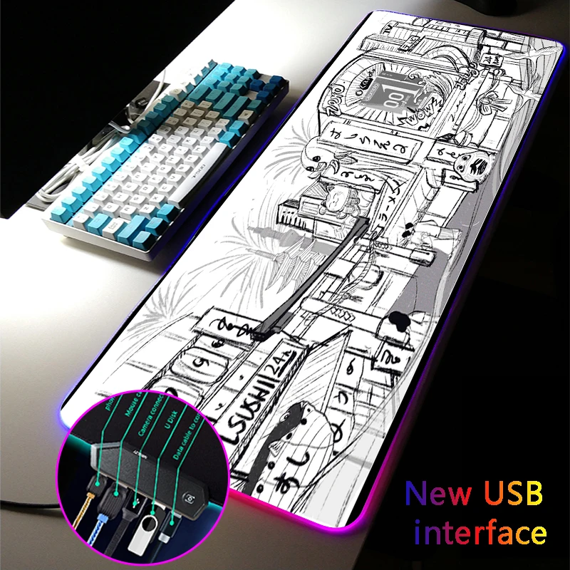 Игровой коврик для мыши MRGLZY с RGB-подсветодиодный кой, 4-портовый коврик для мыши в японском уличном стиле, черный и белый цвета, большой Настольный коврик для игр, компьютера, ПК, Csgo