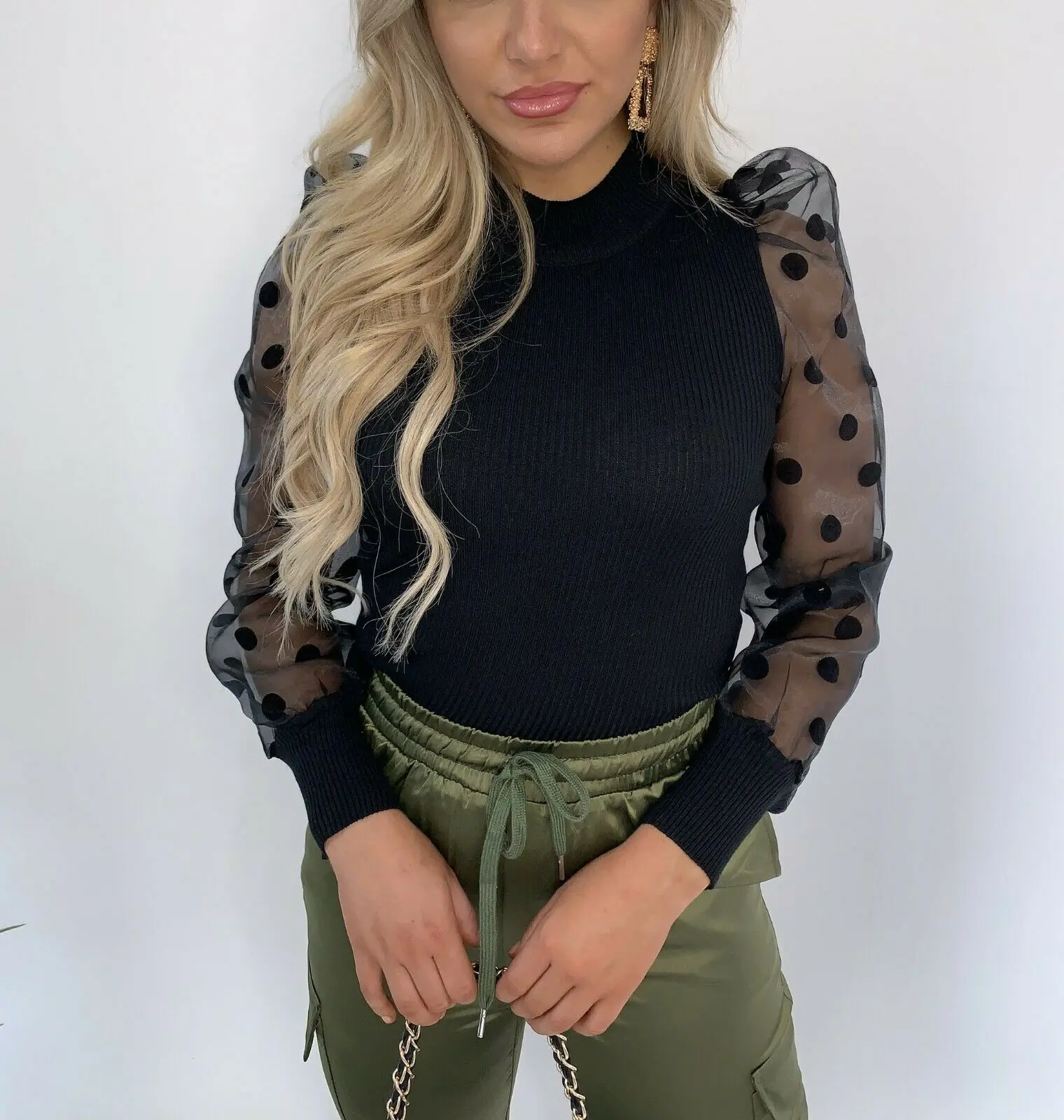 Женская трикотажная рубашка, в горошек, с пышным длинным рукавом