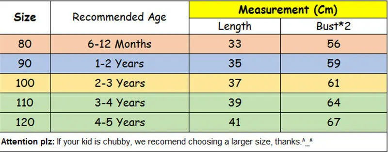 Размеры Топы Бюст Возраст 80 33 см 56 см 6-12 месяцев 90 35 см 59 см Для детей от 1 до 2 лет 100 37 см 61 см От 2 до 3 лет 110 39 см 64 см От 3 до 4 лет 120 41 см 67 см От 4 до 5 летИз-за ручных измерений возможна погрешность в 2-3%. Прежде чем купить эту товарную позицию, просим тщательно свериться с таблицей размеров. 1 дюйм = 2,54 см Обратите внимание что небольшая разница в цвете считается приемлемой. Это может быть связано с положением источника света и с настройками экрана.