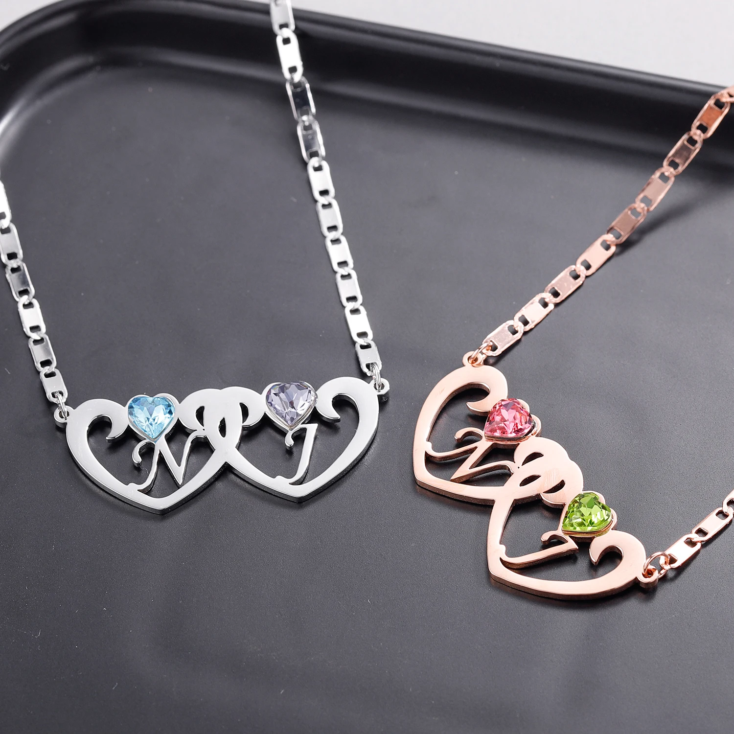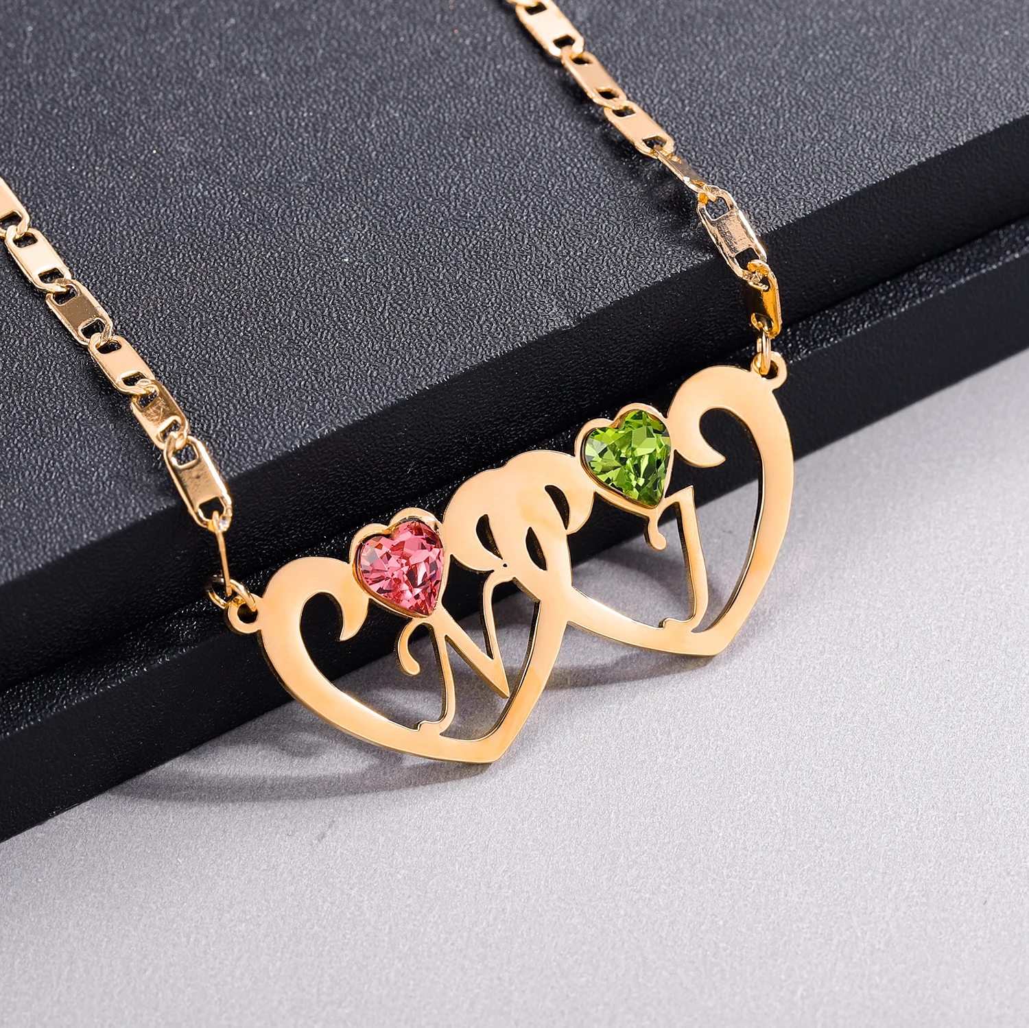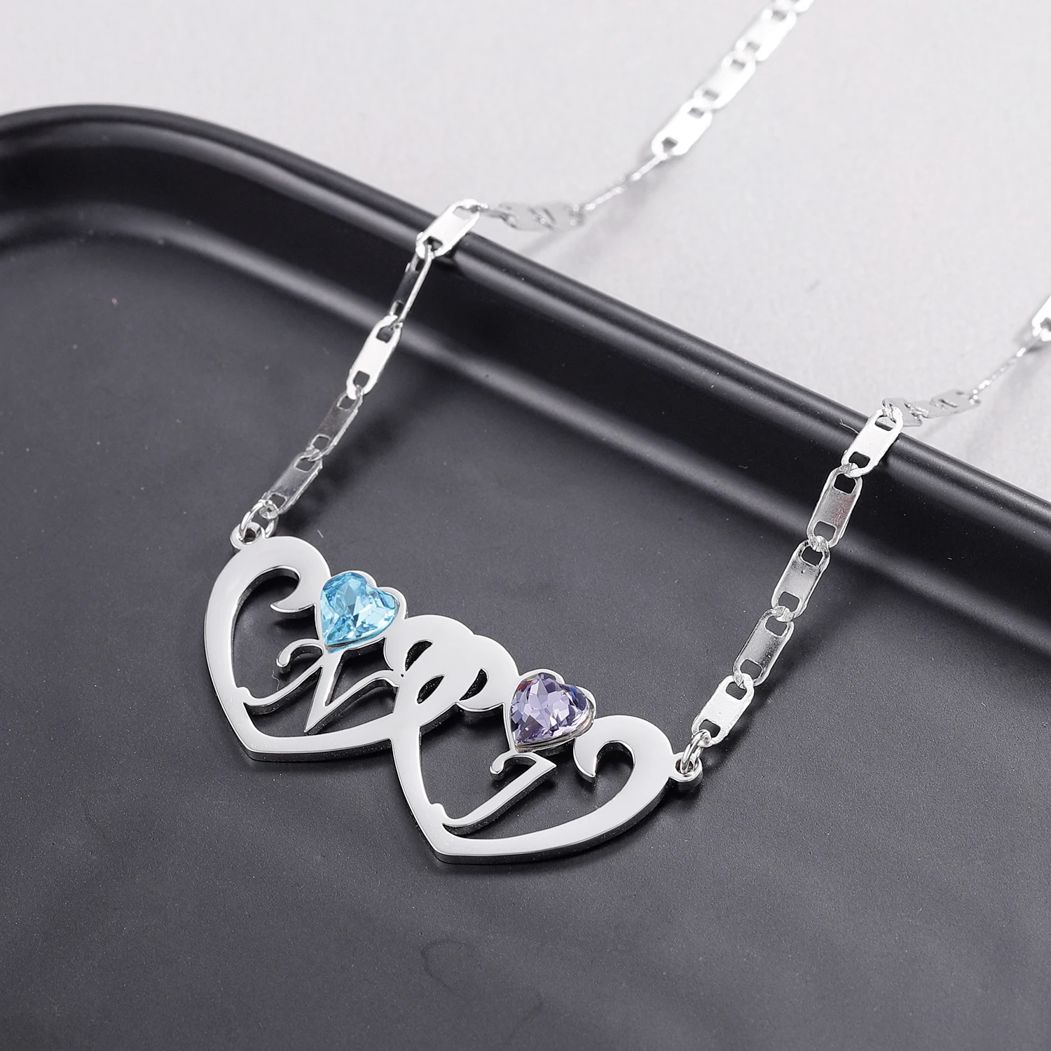 Индивидуальное ожерелье с двойным кулоном в форме сердца, 2 камня по месяцу рождения, индивидуальное имя, гравировка, женское ожерелье, индивидуальные ожерелья