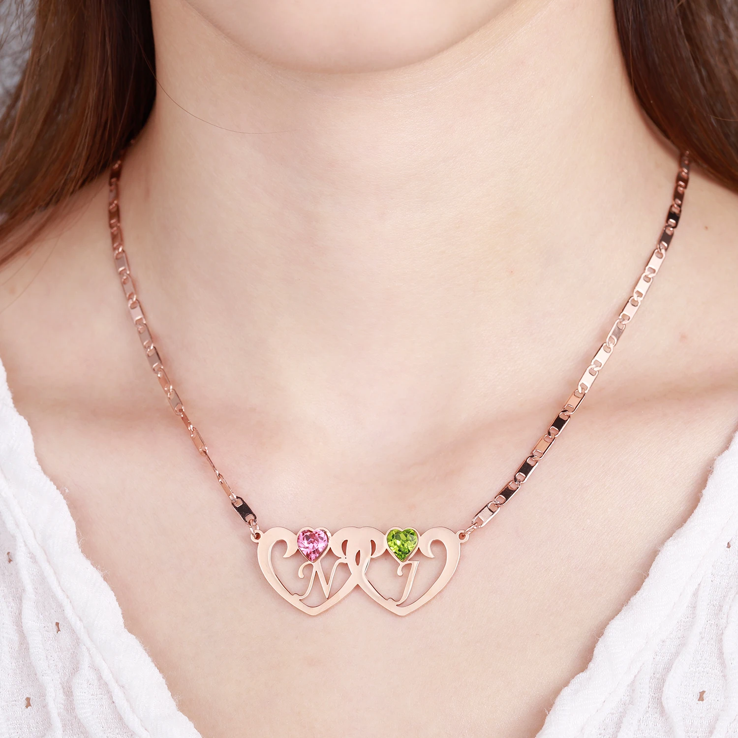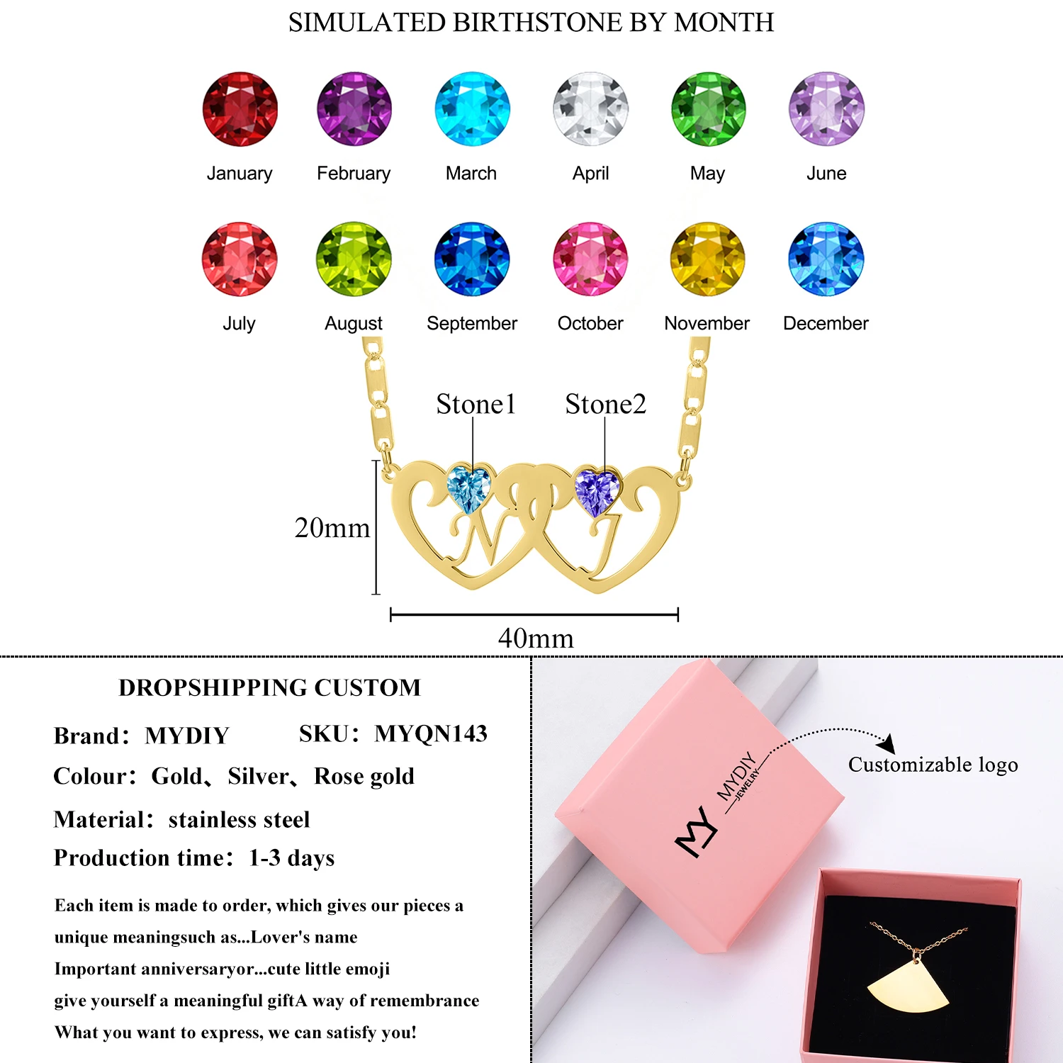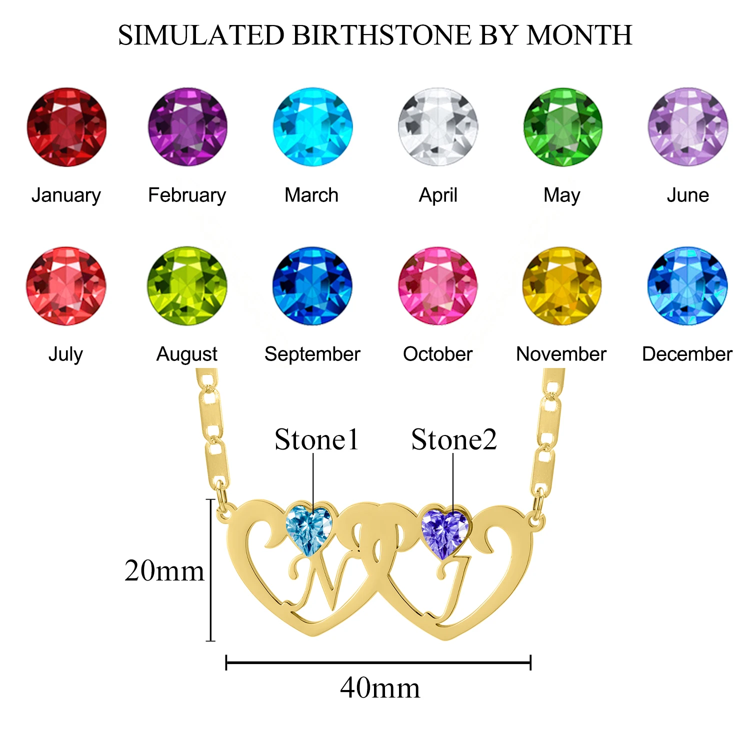 Индивидуальное ожерелье с двойным кулоном в форме сердца, 2 камня по месяцу рождения, индивидуальное имя, гравировка, женское ожерелье, индивидуальные ожерелья
