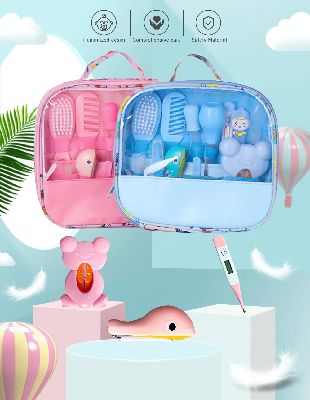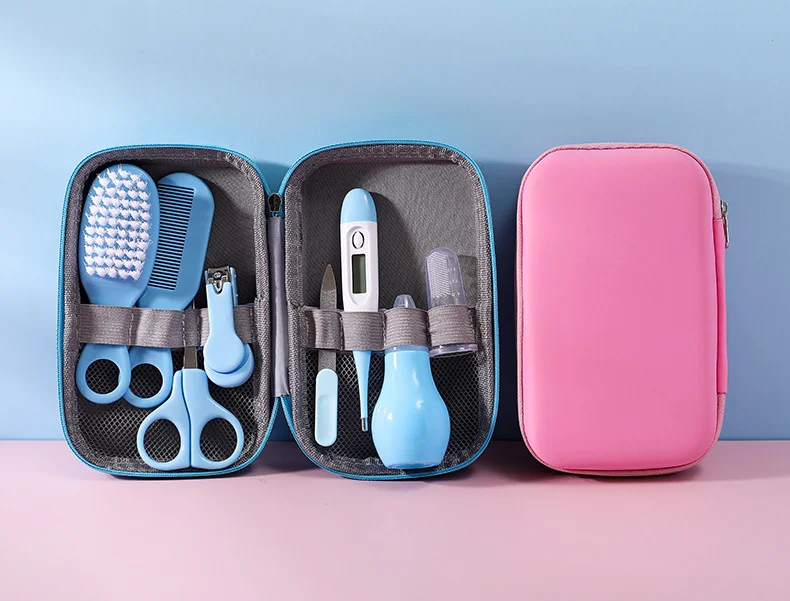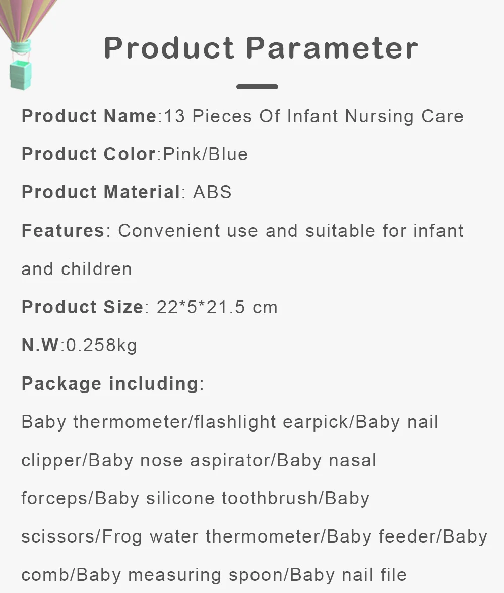 13 шт. в одной упаковке 1x очиститель носа с крышкой 1x Фонарик Earpick 1x зубная щетка с дизайном пальцев 1x Мягкая щетка для волос 1x Детский термометр 1x машинка для стрижки ногтей 1 пинцет 1 ножницы с круглой головкой 1x гребень для волос 1 Детская мерная ложка 1х пилка для ногтей 1 шт. кормушка для малышей 1x термометр для воды с лягушкой