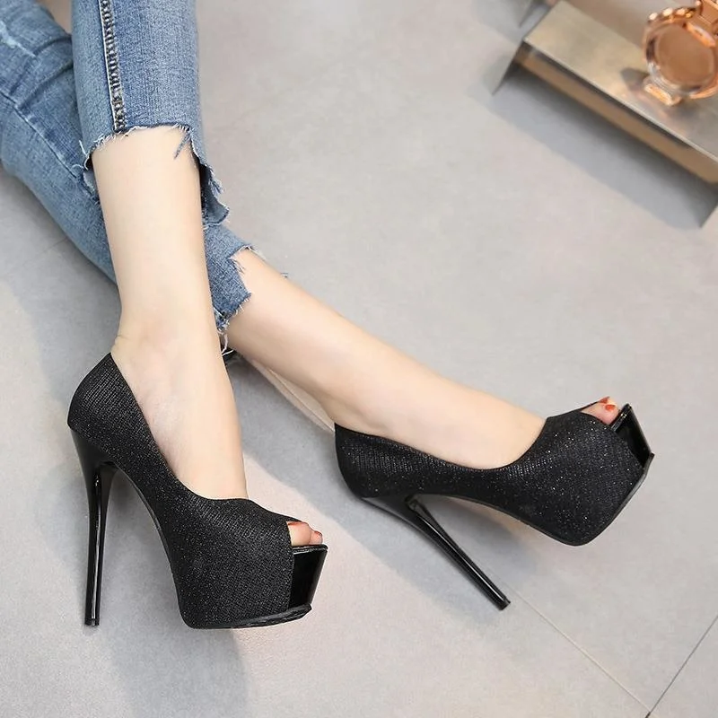 [Плата за возврат упаковки] туфли на очень высоком каблуке 12 см, водонепроницаемая платформа тонкий каблук, профессиональная рабочая обувь для ночной сцены черные девичьи универсальные туфли с открытым носком