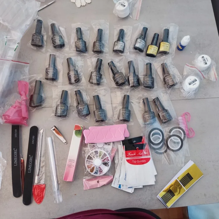 Товар пришел в течение 2-3 дней, очень быстро. В комплекте 18 гель-лаков, 2 верхних слоя, 2 основных слоя, 3 УФ-геля (розовый, белый и прозрачный) и много для украшения ногтей. Такие как блестки и вкладыши. И у вас есть технические продукты, лампа, 2 файла и т. Д .. Очень доволен комплектом, рекомендую! Мне нужно только попробовать сейчас.