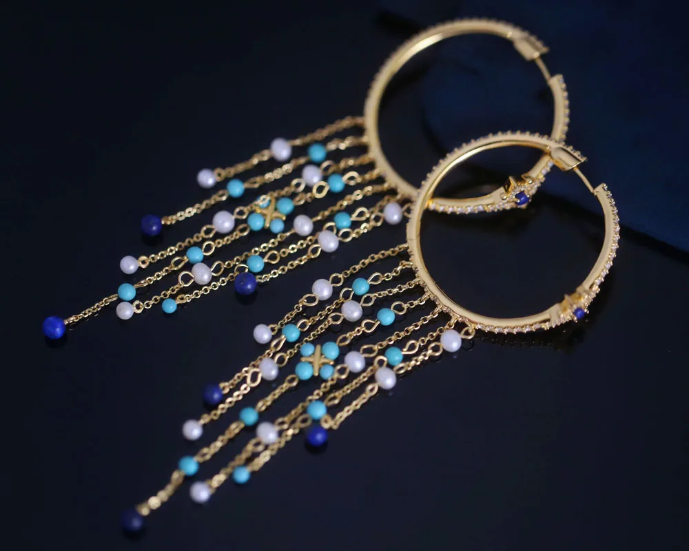 Женские серьги-кольца из серебра 925 пробы, с синими камнями