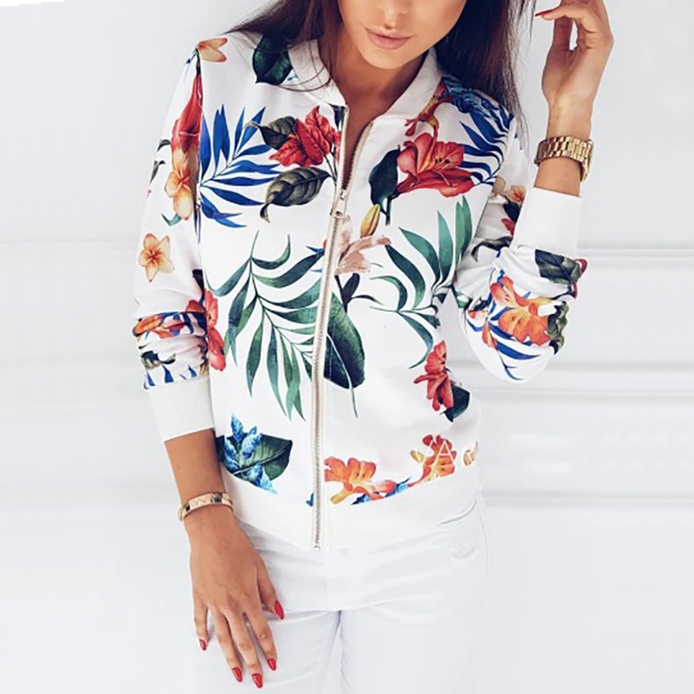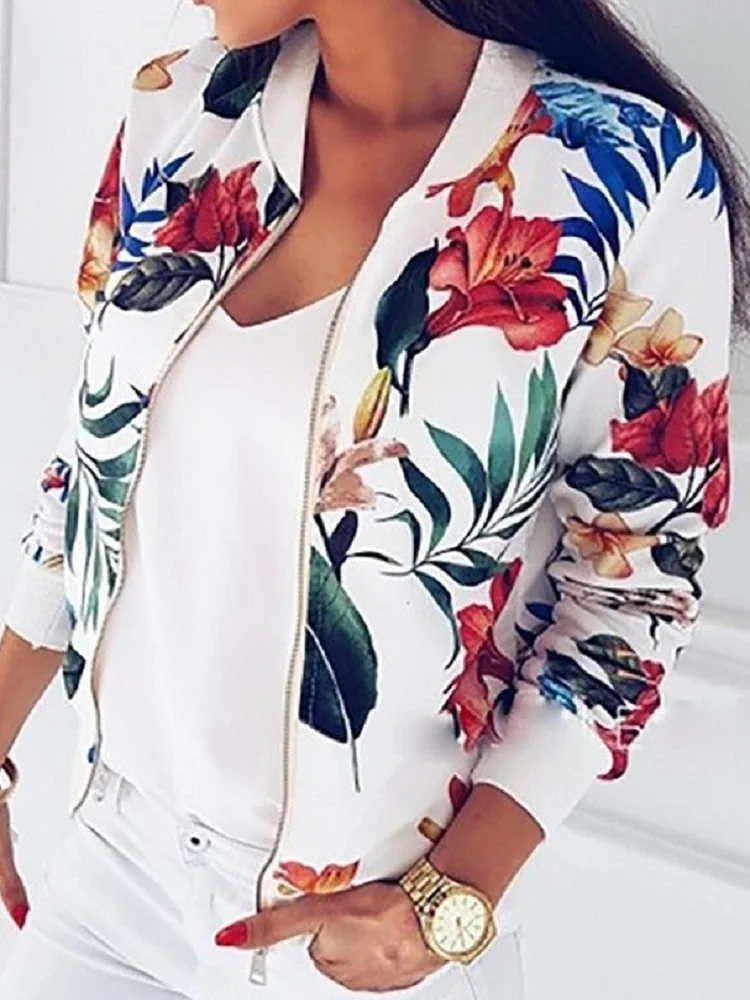 Куртка-бомбер женская с длинным рукавом, пиджак на молнии с цветочным принтом, Повседневная приталенная модная верхняя одежда с карманами, большие размеры, весна-лето