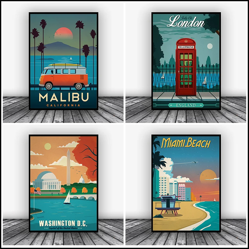 Настенная живопись на холсте, постер для путешествий, Hd-принты, изображения Лондона, Малибу, Майами, для домашнего декора, городской винтажный пейзаж