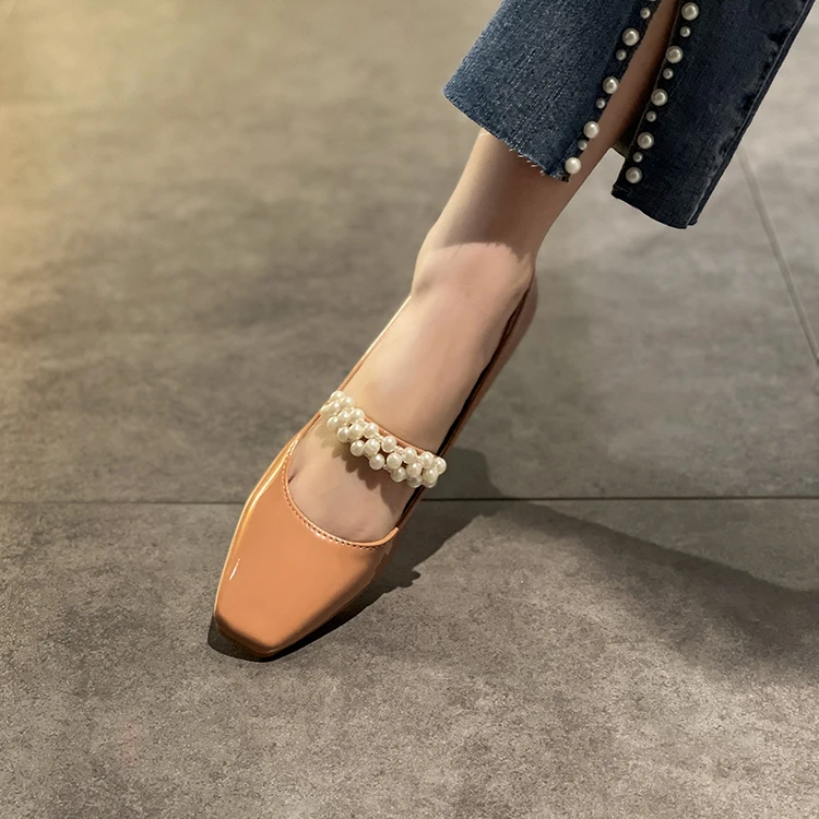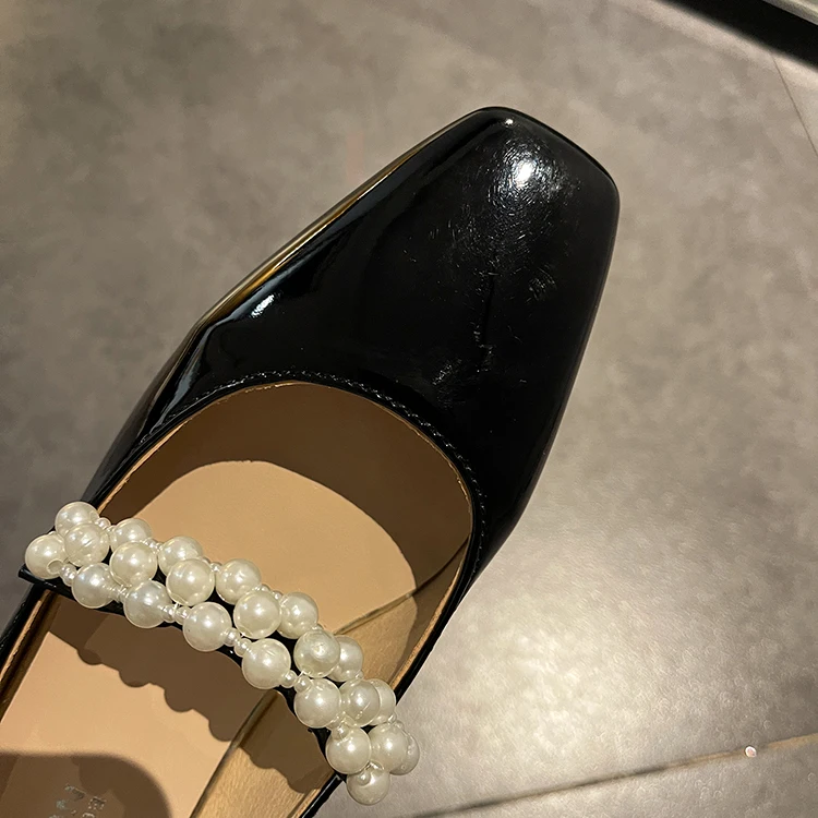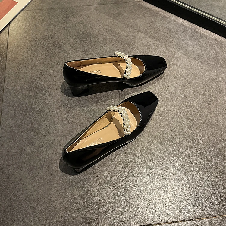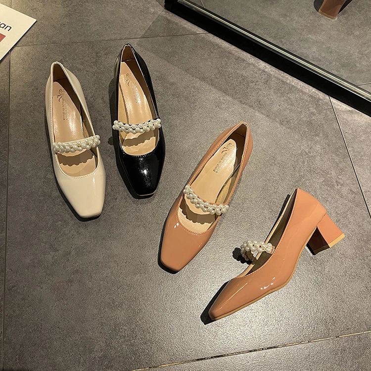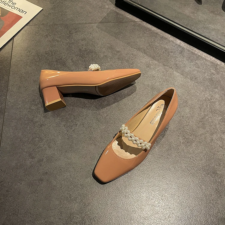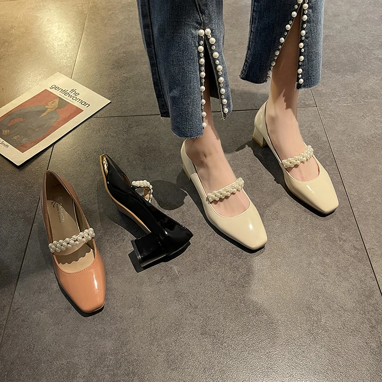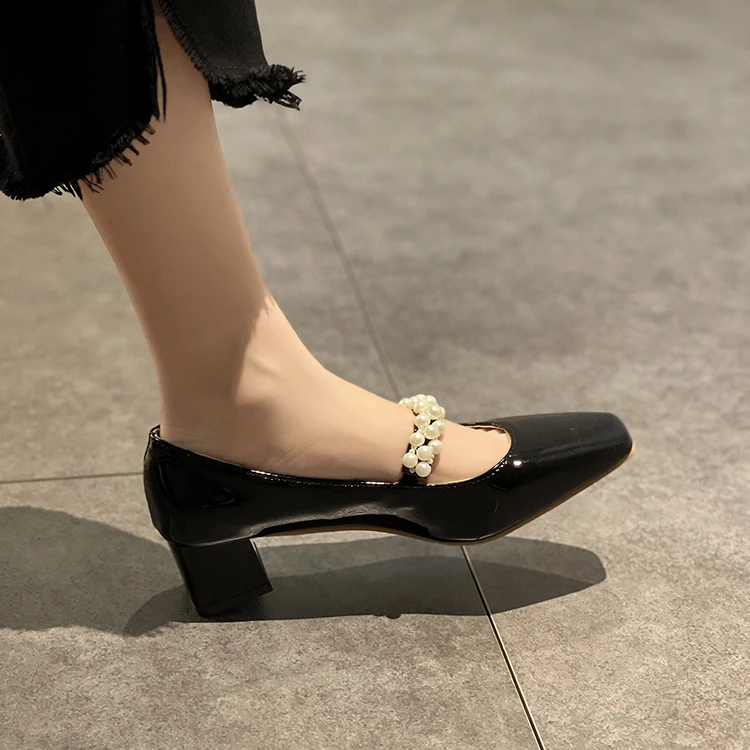 Женские классические туфли, лакированная кожа, на среднем каблуке, туфли Мэри Джейн, шнурок для обуви, туфли-лодочки с бусинами, свадебные туфли с жемчугом 9356N