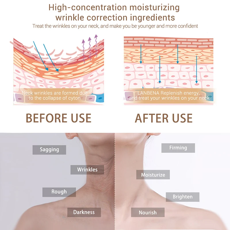 Свойства: Благодаря специальным ингредиентам этот крем увлажняет кожу после нанесения. Капли воды интенсивно питают и увлажняют кожу шеи, уменьшая морщины и снимая провисание. Название бренда: LANBENA Название продукта: крем для шеи LANBENA Hydratante Характеристики: 45 г Типы кожи: подходит для различных типов кожи