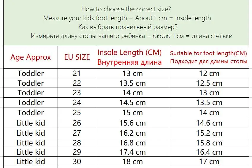 Дорогие друзья:Поскольку все размеры детской обуви отличаются, при заказе детской обуви необходимо ориентироваться на наш размер и внутреннюю длину.В соответствии с длиной стельки (длина стельки = длина стопы + 1 см)Размер США не является стандартным, просто удобно для вас сделать заказ.Комфортной длиной является длина стопы прибавьте около 1 см.И из-за длительного времени доставки к авиа-отправление Почты Китая году и ребенок будет расти быстро, пожалуйста, выберите обувь на размер больше для вашего ребенка.Пожалуйста, выберите правильный размер.Вся обувь будет отправлена в пузырчатых пакетах, без коробок!