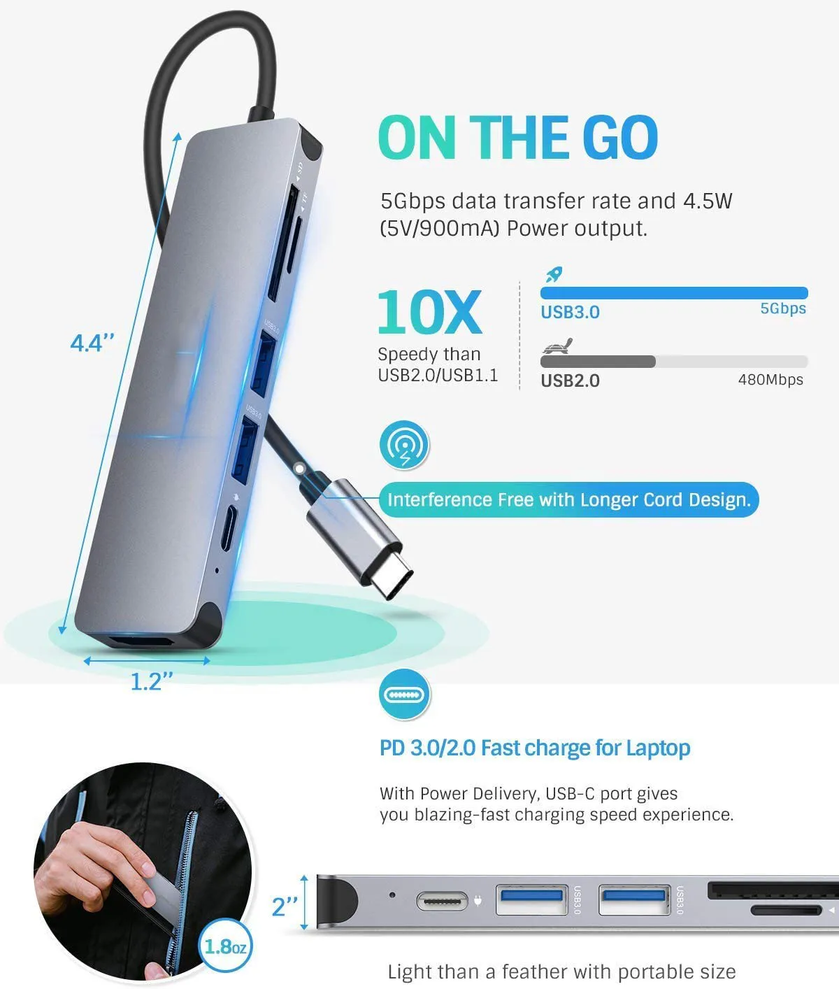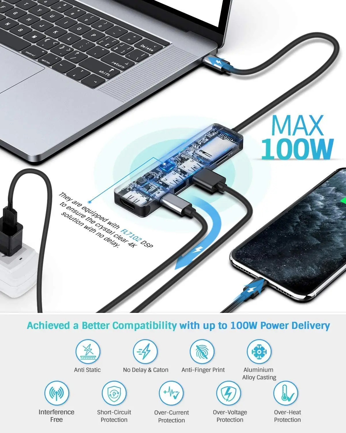 6 в 1 концентратор USB C: Интеллектуальный адаптер USB C прекрасно сочетает все необходимые вам функции. USB C к HDMI концентратор оснащен USB3.0 x2, 4K @ 30 HDMI, SD/TF карты адаптер, и до 100 Вт/20 в/5A Тип C питания порт зарядки.4K HDMI к USB C концентратор: USB C концентратор предоставляет вам реалистичные изображения HDMI 4K 3840x2160 @ 30Hz, которые обеспечивают захватывающее 3D разрешение.Поддержка питания 100 Вт: концентратор USB C поддерживает сквозную зарядку USB C 100 Вт, идеально подходит для MacBook Pro/Air или других устройств USB c, ваш основной выбор USB C Hub.Эффективно USB C концентратор: два высокоскоростных USB-A 3,0 порта, способные передавать 5 ГБ/сек. скорость для быстрой передачи данных и зарядки до 5V@0.9A. Подключи и работай, не требуется программное обеспечение, драйверы.Путешествия Размеры SD/TF адаптер USB C: алюминиевого сплава под высоким давлением и 2,4 унций карман Размеры, 5 Гбит/с чтения и записи, мощностью до 2 ТБ карты. Идеально подходит как Mac Book Pro USB C Hub/USB C концентратор для ноутбука для путешествий.