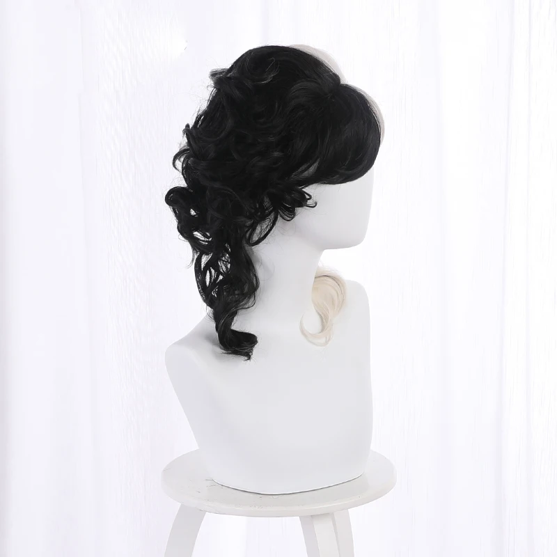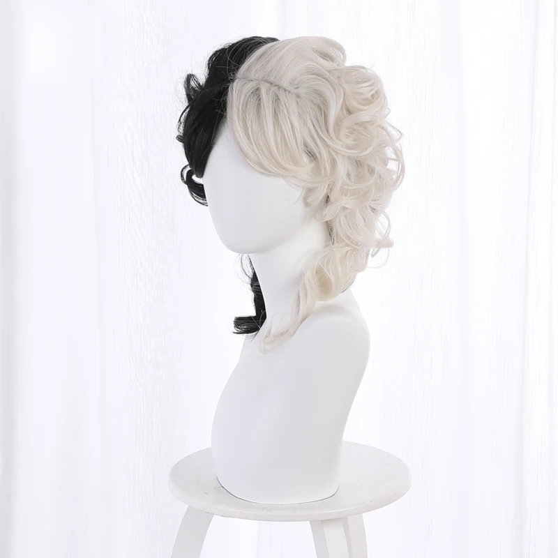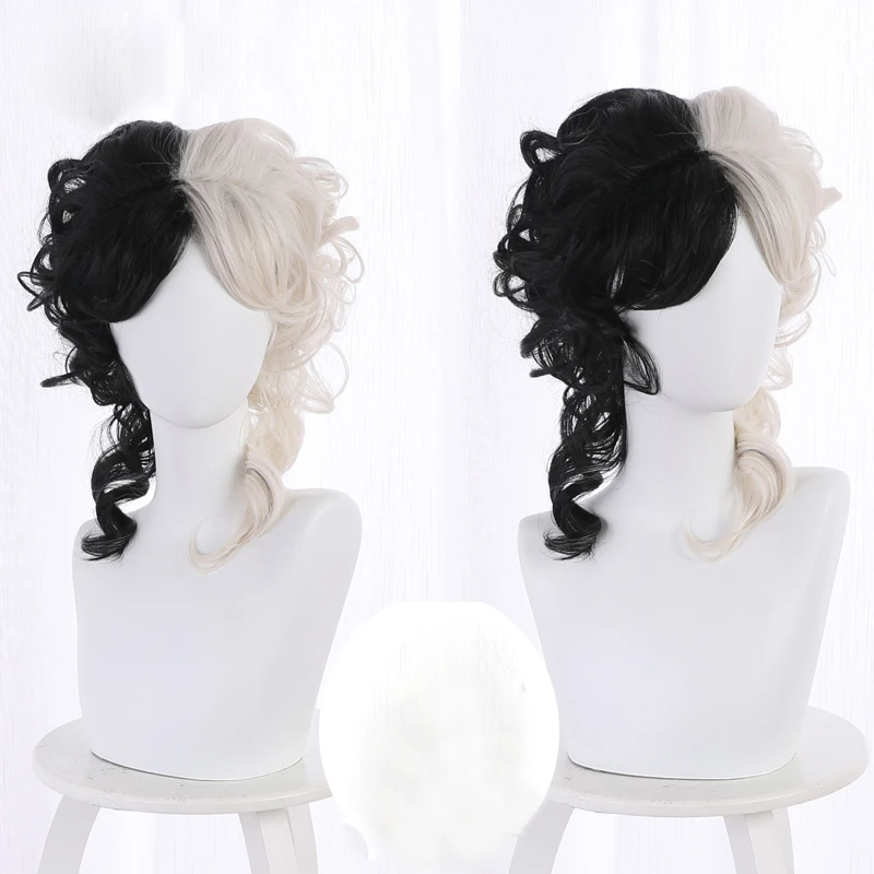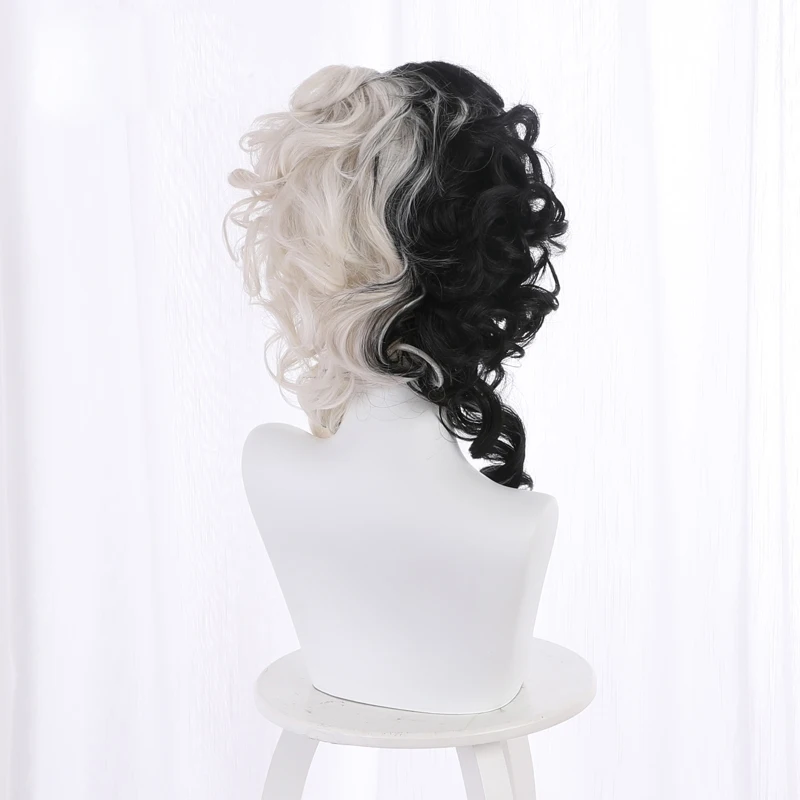 Парик для косплея Cruella De Vil Kuila, термостойкие синтетические волосы с короткими вьющимися волосами, половина черного, полуста, с шапочкой