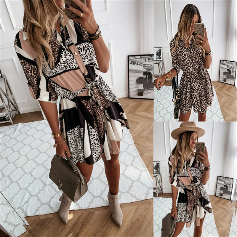Платье Осенняя Новинка рубашка с леопардовым принтом пояс приталенн...