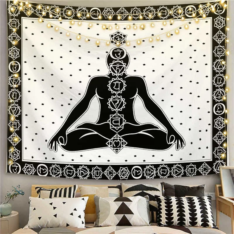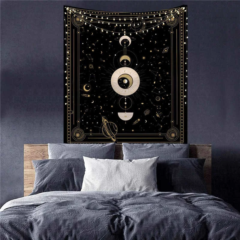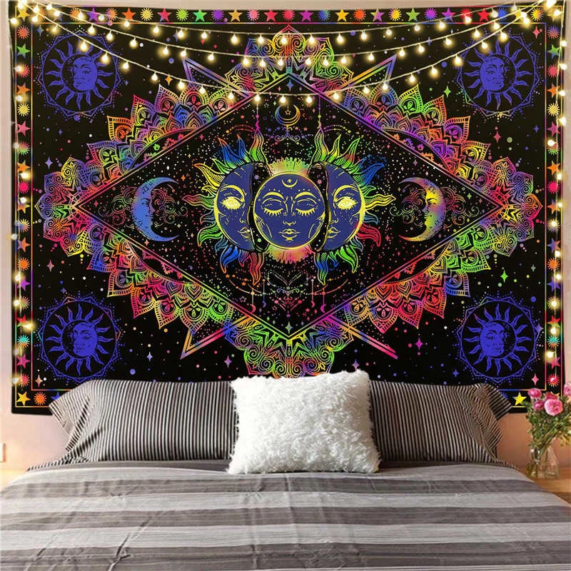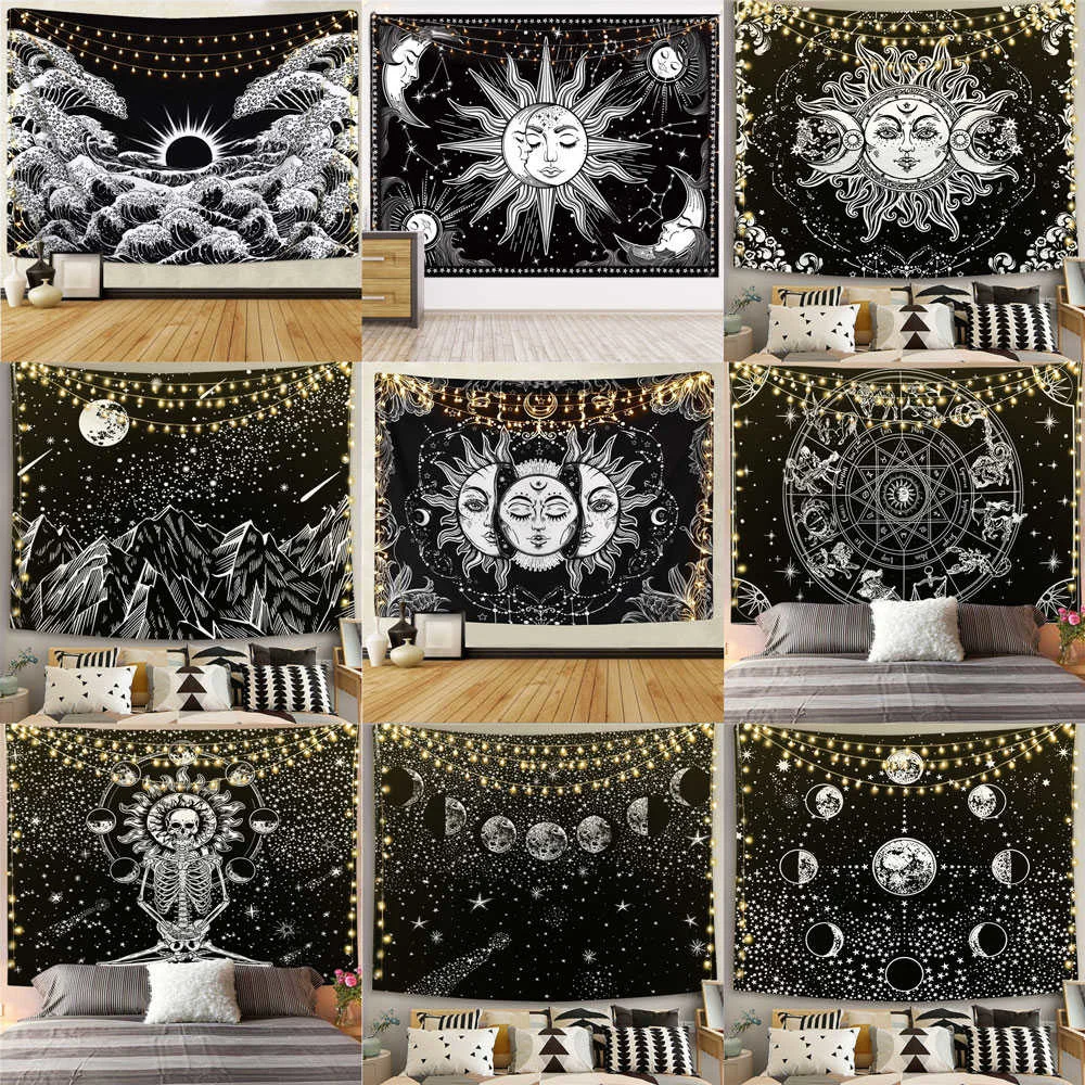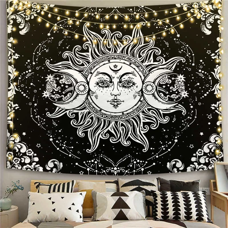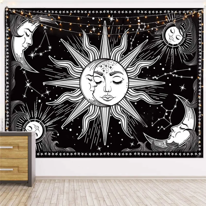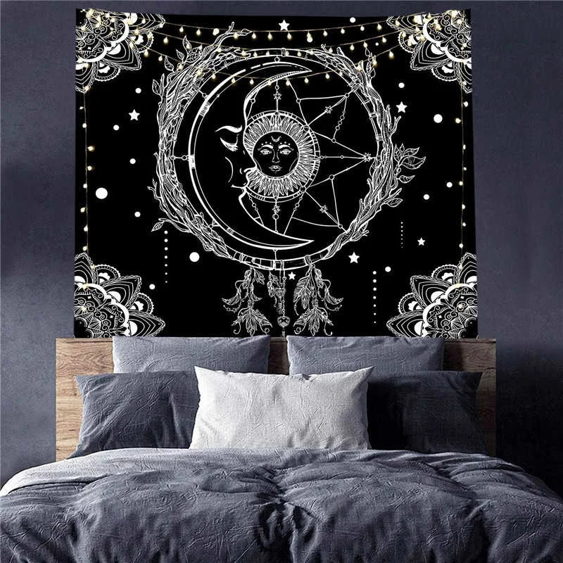 Гобелен с мандалой, белым, черным солнцем и луной, настенные гобелены, украшения в стиле хиппи