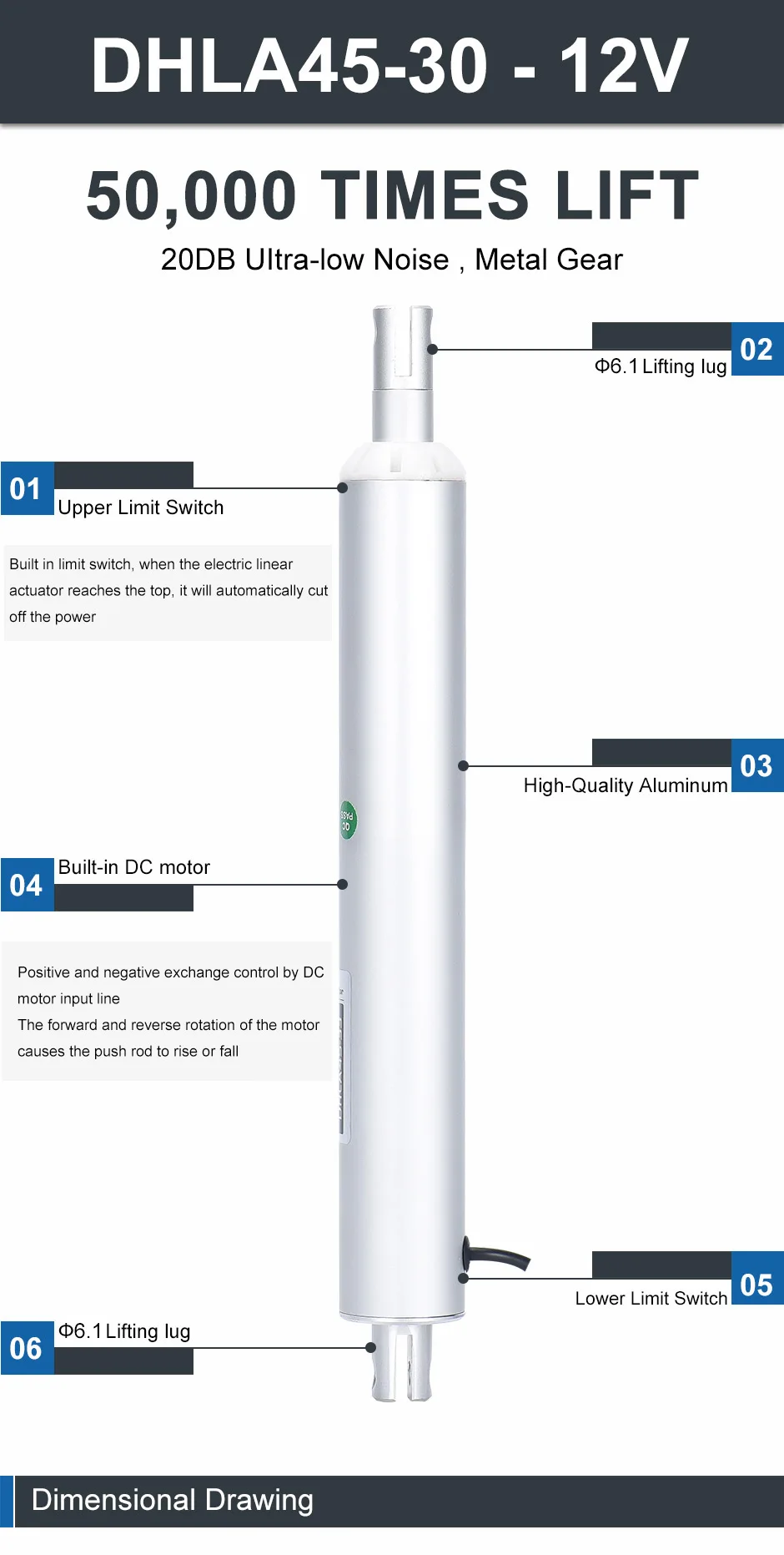 Максимальная нагрузка: 3000NМаксимальная скорость: 88 мм/сек.Максимальный ход: 1600 ммТемпература: -30 ℃ ~ + 60 ℃Шум: 25 дБМощность двигателя: 60 ВтДополнительная функция: IP66 | Встроенный магнит | IP67Опциональная Функция: отзывы сигнала верхнего и нижнего пределаВнутренняя трубка: Алюминий высокой твердости | Обработка окислением 27 предметовКачество:★★★★★