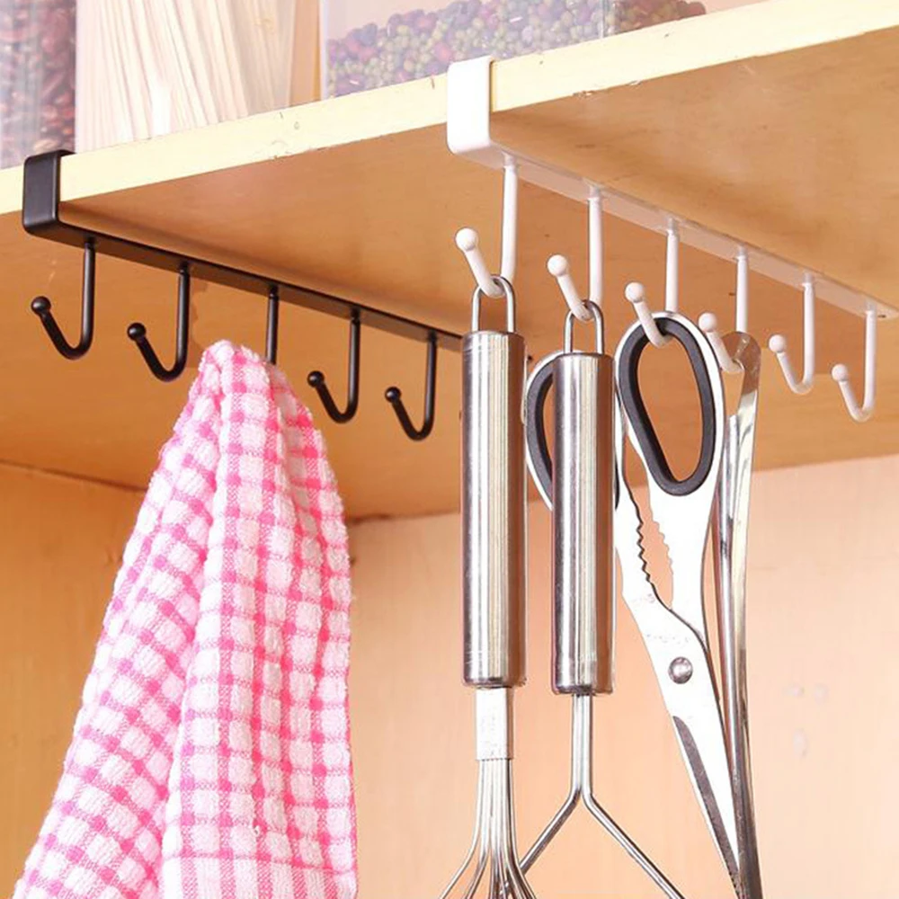 Металлическая железная полка с 6 крючками для хранения под шкафом, органайзер для кофейных чашек, кружек, держатель для кухонного шкафа, полка