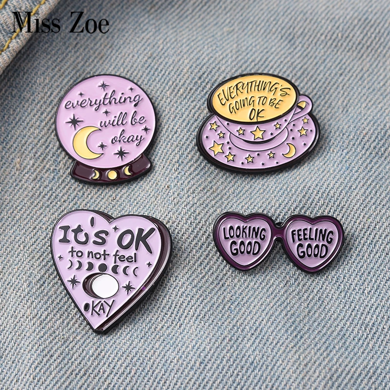 Эмалевые булавки с фиолетовым сердцем, фазой Луны, мотивационные ци...