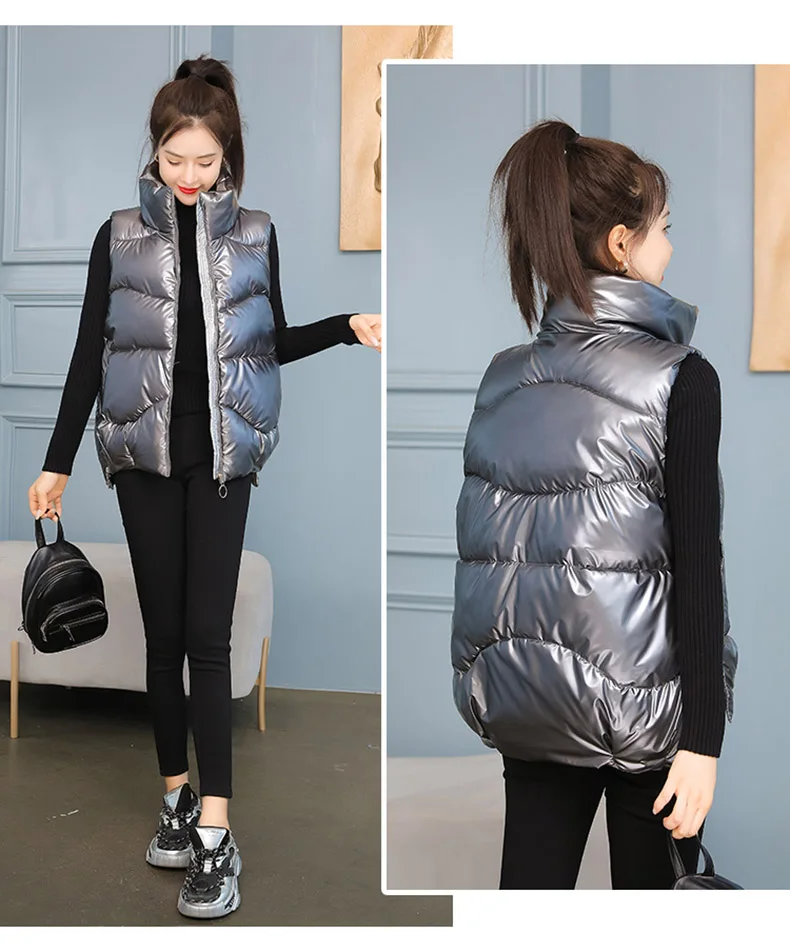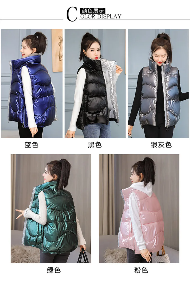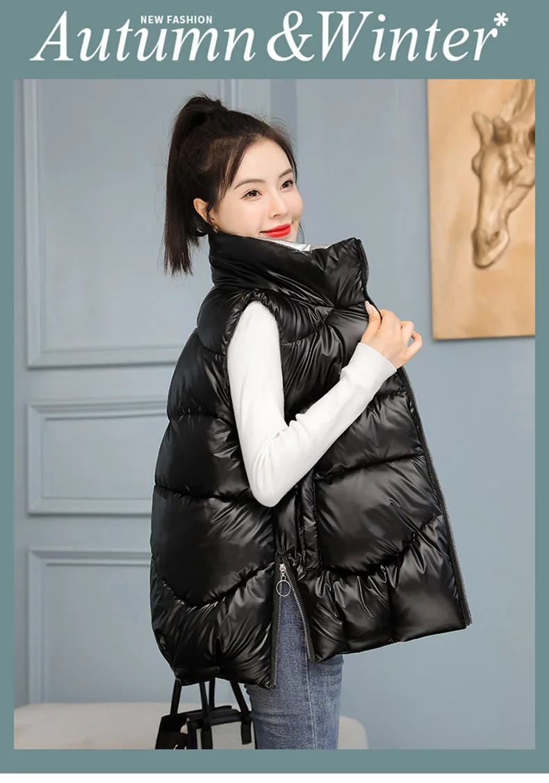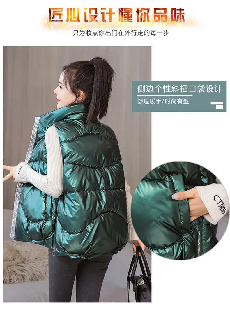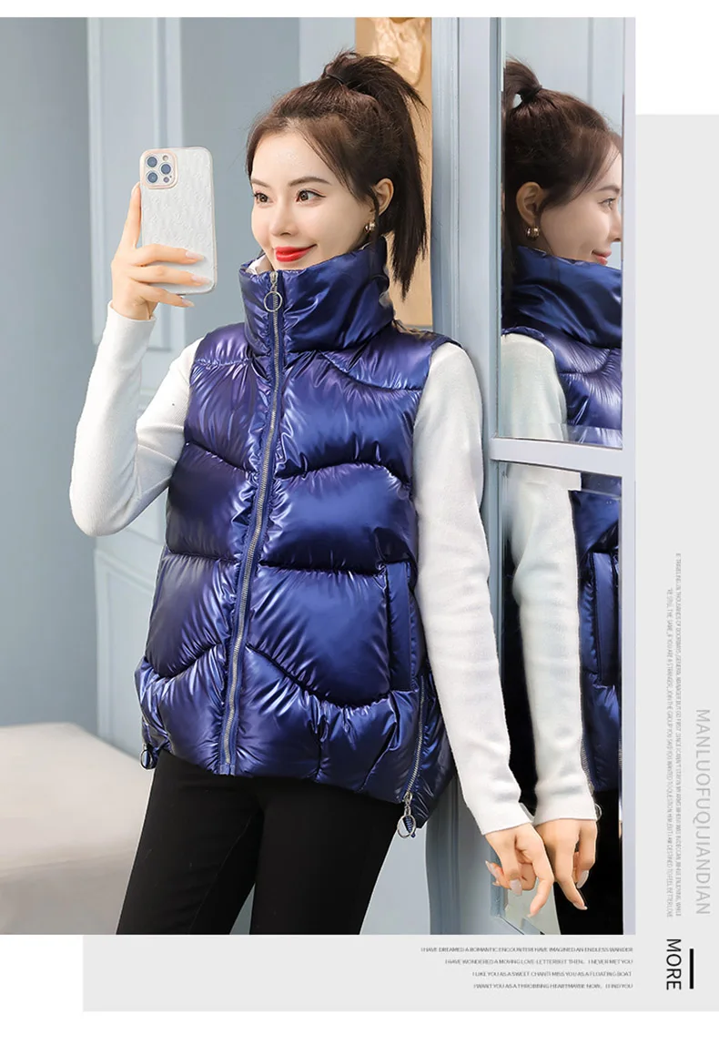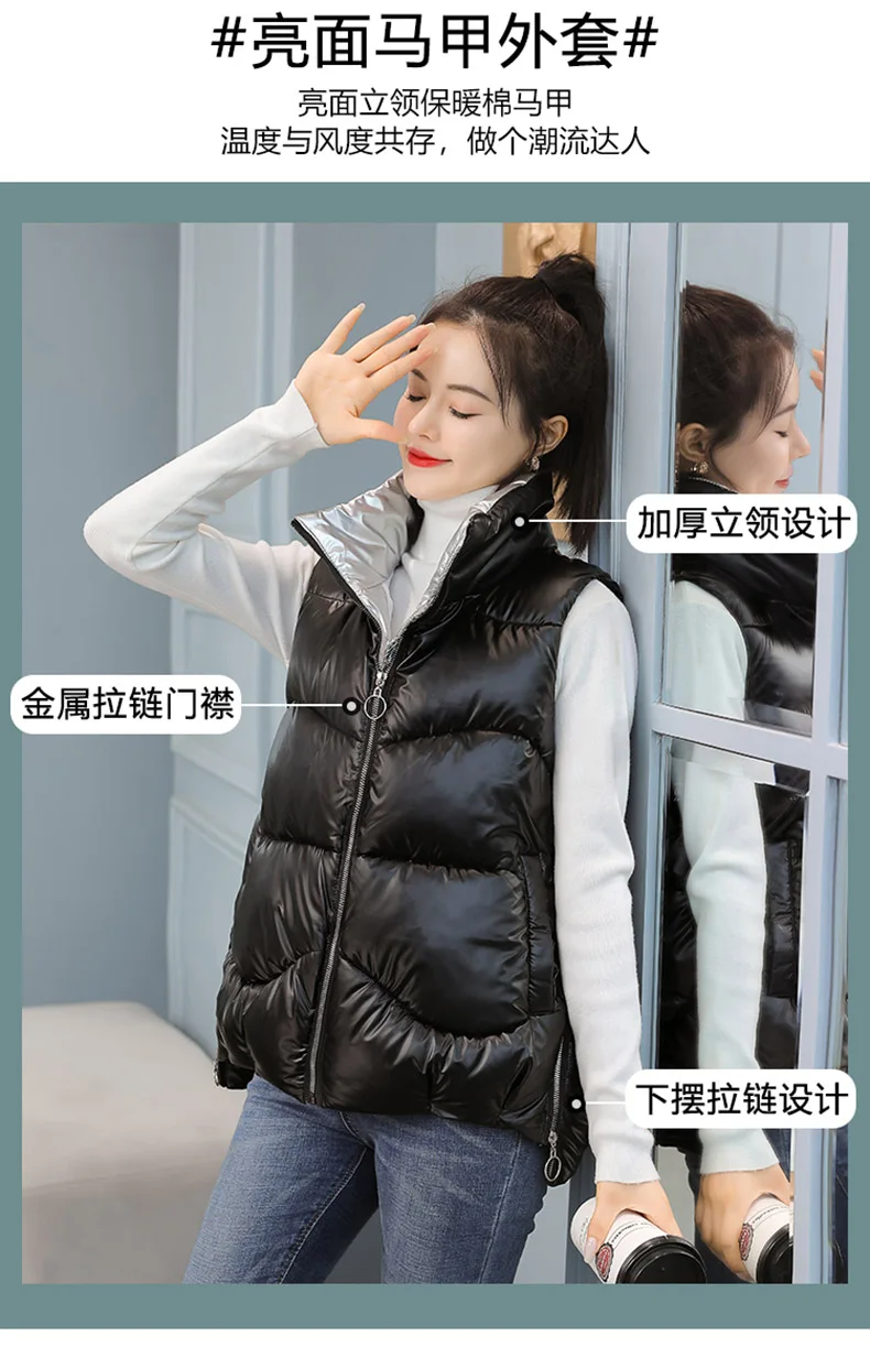 Женская осенне-зимняя однотонная одежда 2021, Модный глянцевый тонкий хлопковый жилет на молнии в Корейском стиле