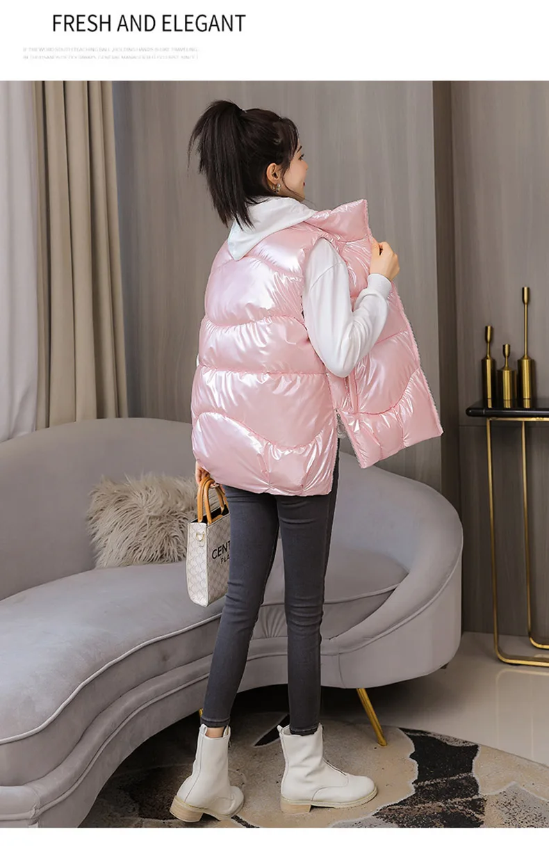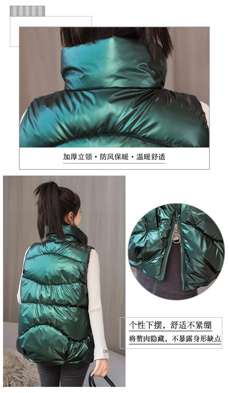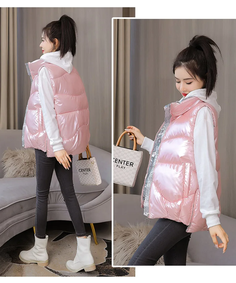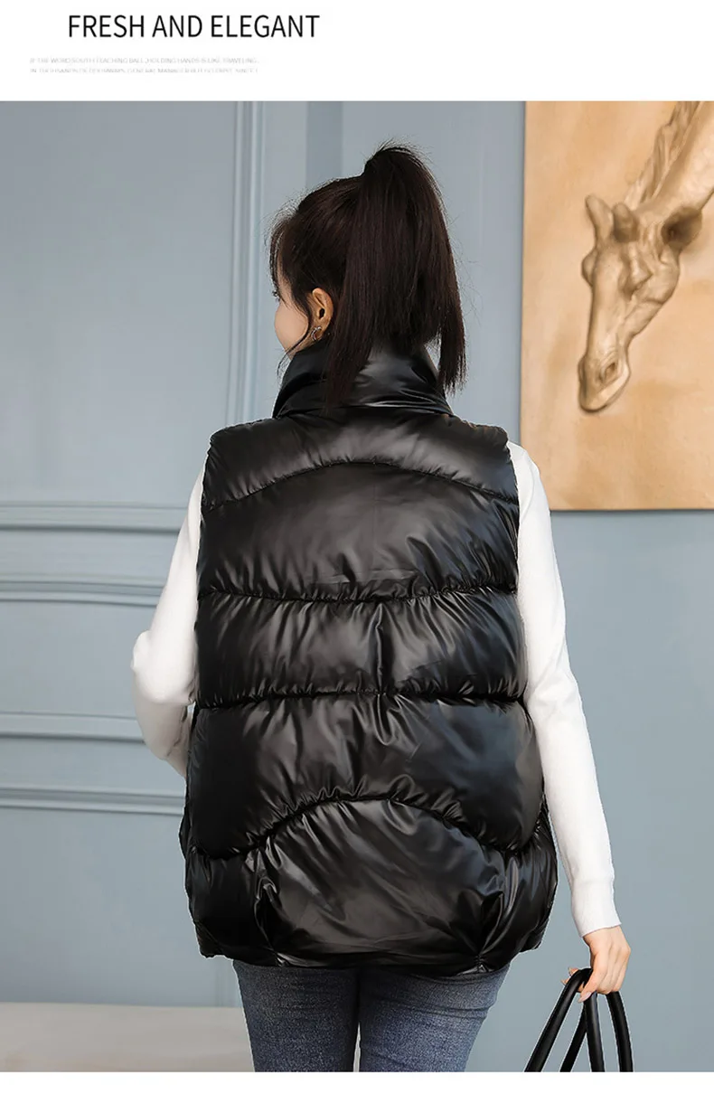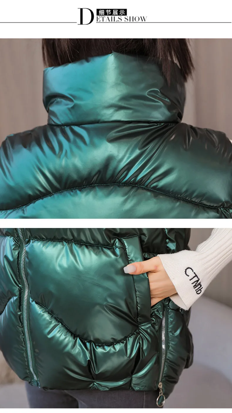 Женская осенне-зимняя однотонная одежда 2021, Модный глянцевый тонкий хлопковый жилет на молнии в Корейском стиле