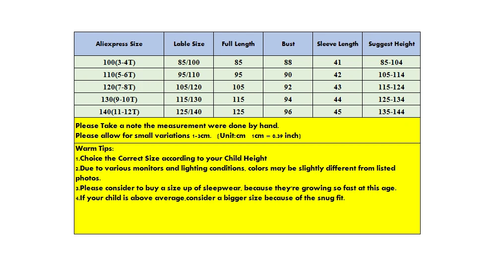 Теплые советы:1. Выберите правильный размер в соответствии с ростом вашего ребенка2. Из-за различных мониторов и условий освещения цвета могут немного отличаться от приведенных фотографий.3. Пожалуйста, подумайте о том, чтобы купить одежду для сна на размер больше, потому что они растут так быстро в этом возрасте.4. Если ваш ребенок выше среднего, учитывайте больший размер из-за плотного прилегания.