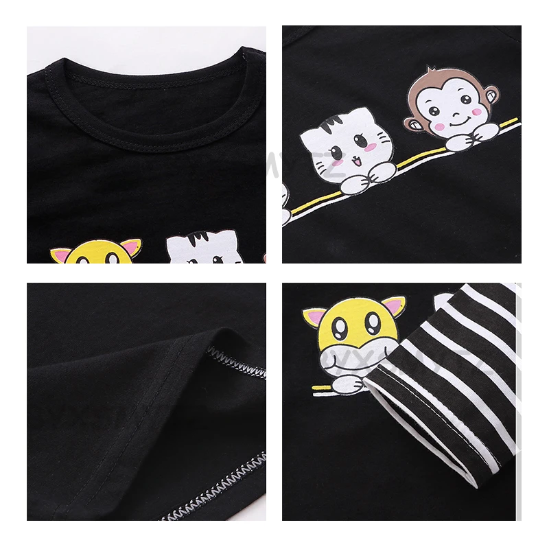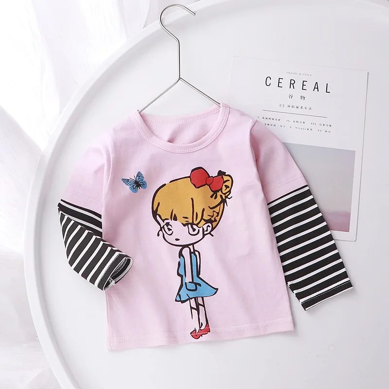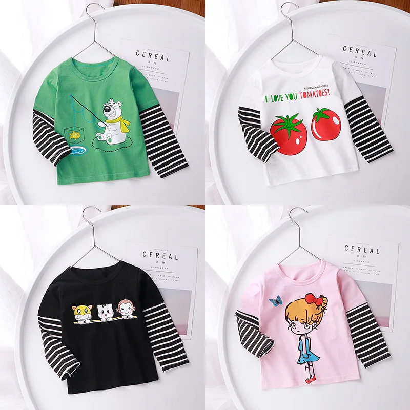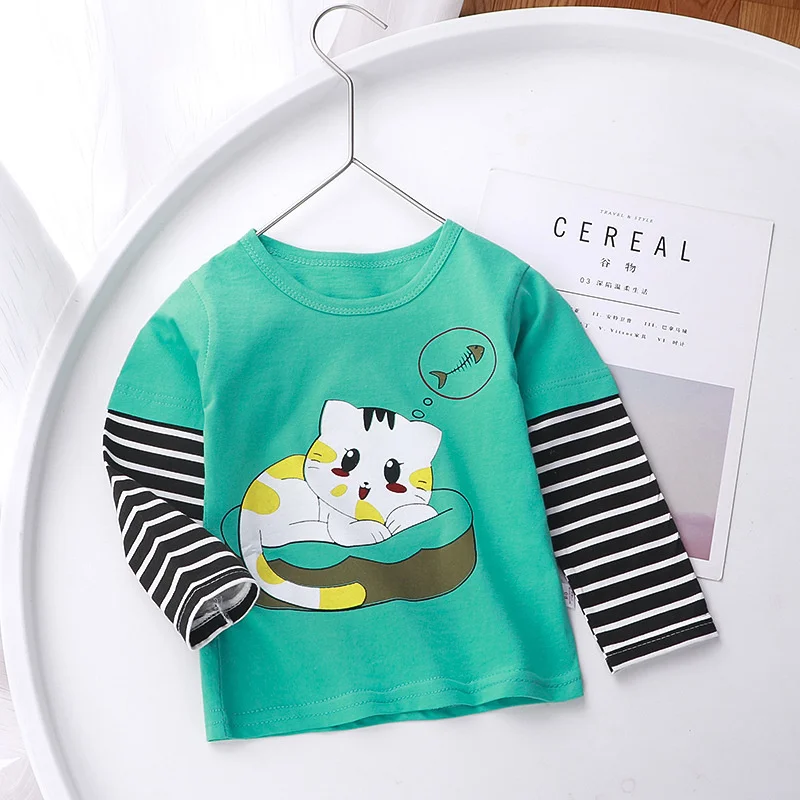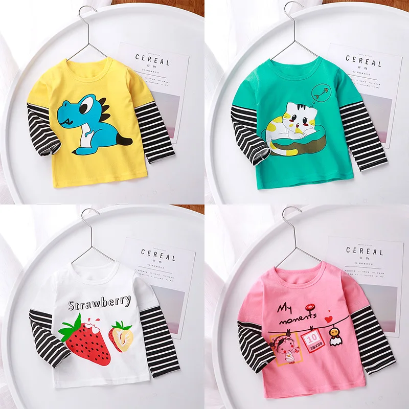 Детская одежда, футболка с длинным рукавом, весна-осень, Корейская мультяшная хлопковая рубашка для маленьких мальчиков и девочек, топ с имитацией двух предметов, детская одежда