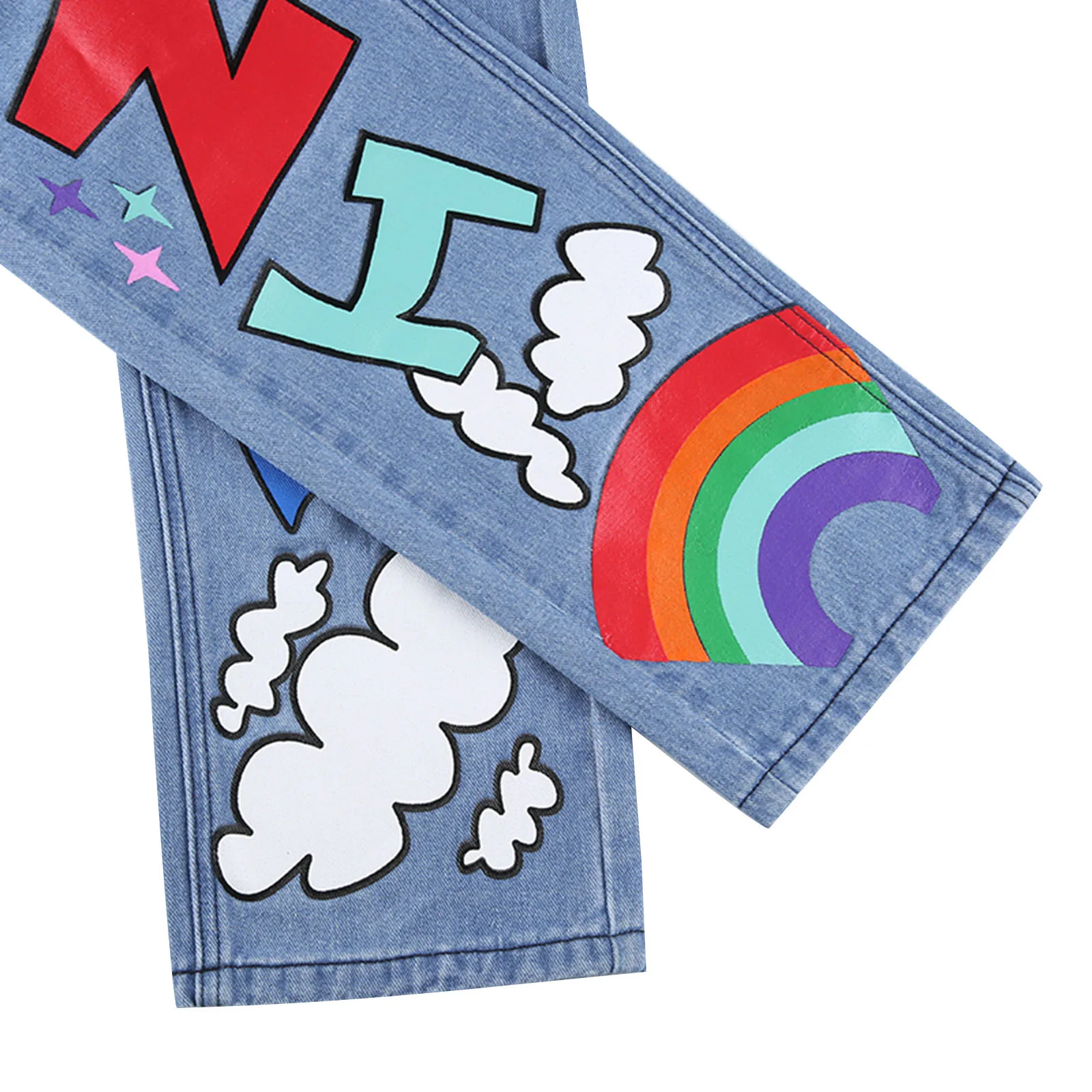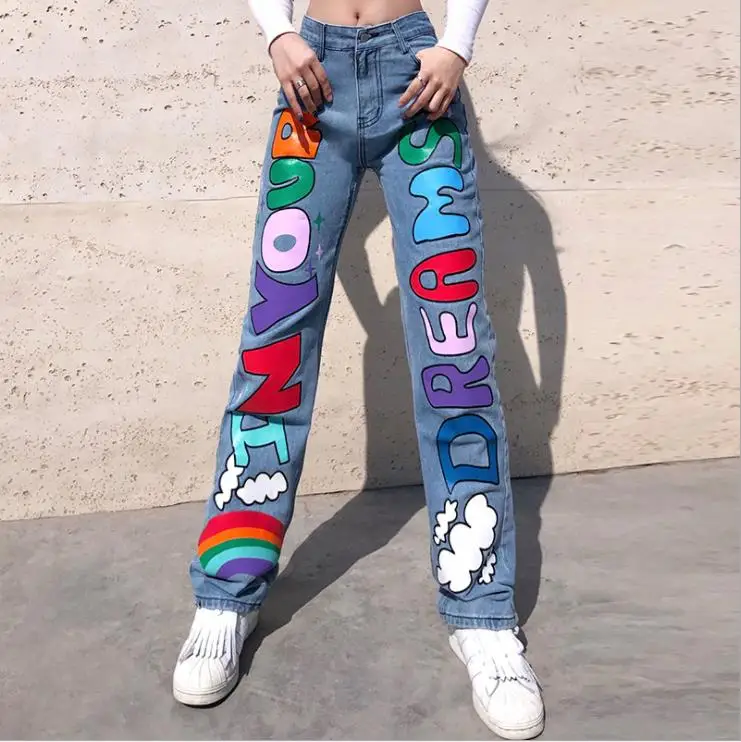 Женские прямые джинсы с буквенным принтом, Разноцветные длинные джинсовые брюки с высокой талией, осенние корейские женские свободные брюки, уличная одежда