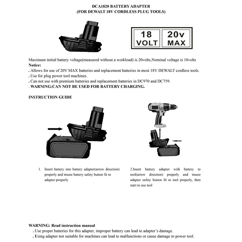DCA1820 адаптер батареи для DEWALT 20V Max до 18V литий-ионные беспроводные инструментыОписание:Совместимость с Dewalt 18/20V литиевые батареи.Подходит для Dewalt 18V Ni-Cad и никель-металл-гидридного Мощность инструменты.Максимальное Начальное напряжение батареи (измеряется без рабочей нагрузки)-20 вольт, номинальное напряжение-18 вольт.Легко устанавливается и снимается.Спецификация:Цвет: черныйМатериал: ABS + PCBAПосылка Размеры: L * W * H: 12,5*9*11,2 см (4,92*3,54 * 4.4in)Вес брутто: 0,21 кгПосылка включает в себя:1 х адаптер батареи (только адаптер, без аккумулятора)1 x Руководство пользователяПредупреждение:-Не может использоваться для зарядки аккумулятора.-Нельзя использовать с премиальными батареями и сменными батареями в DC970 и DC759.-Используйте подходящие Аккумуляторы для этого адаптера, неправильный аккумулятор может привести к повреждению адаптера