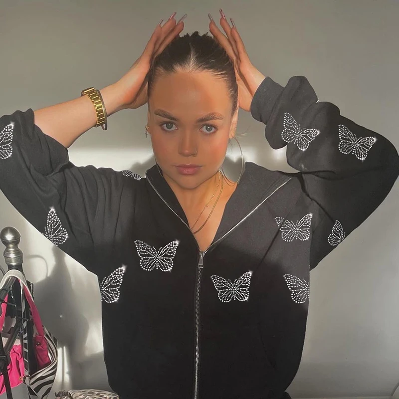 Зимние толстовки y2k с принтом Стразы бабочки на молнии в стиле Хар...