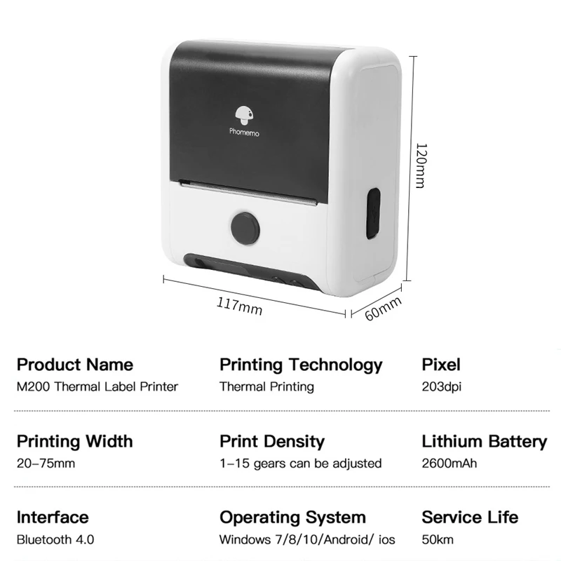 * Производитель этикеток Phomemo M200 подключается по беспроводной сети через Bluetooth, используя технологию термопечати, не требующую чернил или тонера.
