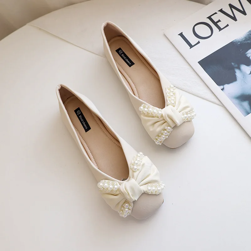 Туфли женские с жемчужным бантом и квадратным носком, удобная мягкая подошва, плоская подошва, повседневные, мягкая подошва