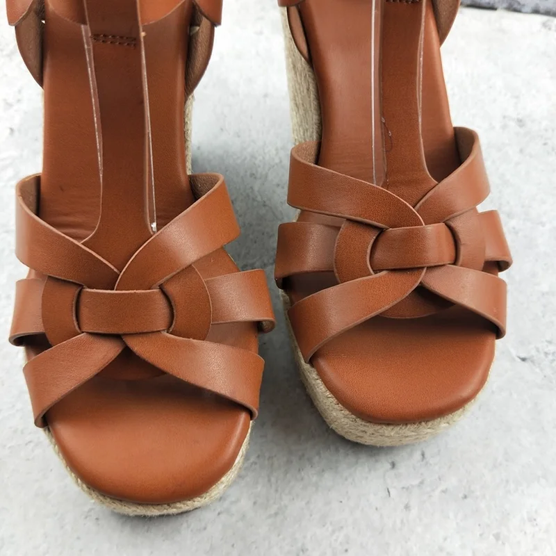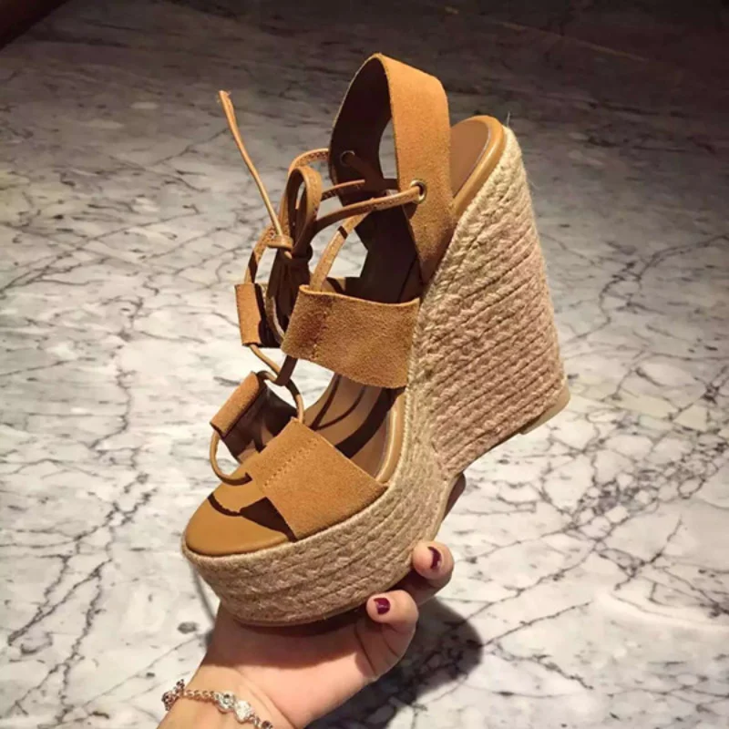 Женские сандалии на очень высокой подошве, босоножки в европейском и американском стиле на танкетке с ремешком на щиколотке и открытым носком, обувь с пеньковой веревкой, лето