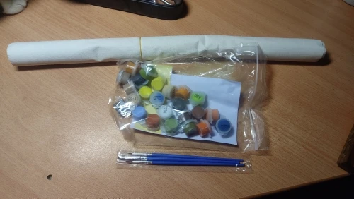 картина до Магнитогорска дошла за месяц, всё целое, краски свежие, в наборе есть кисти, упаковано хорошо, немного помятотот резинки, но ничего страшного, при натяжке на подрамник выровняются, в наборе 24 цвета, в инструкции есть номера цветов и плюс наклейки по номеру которые указаны на картине, очень удобно