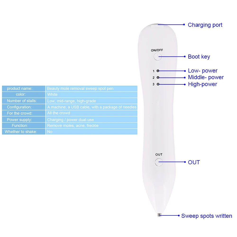 Используя уникальные электрические ионные технологии, можно удалять родинки, бородавки, пятна, веснушки, мясистые невусы, не повреждая нормальную кожу и не окровавляя. Он имеет 3 вида интенсивности для различных процедур. Нижний уровень используется на месте и веснушке. Сильный уровень используется на родине. Компактный, портативный и простой в использовании. Полный заряд может использоваться непрерывно более 5 часов.