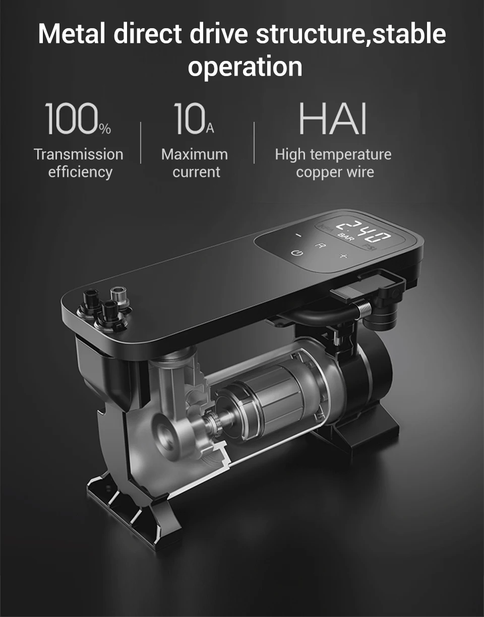 Полностью заполненный газ с пустой шиной на 3 минуты, занимает всего 6 минут для внедорожника пустой шины. Низкотоковый двигатель с постоянным магнитом, оснащенный сердечником из чистой меди, может обеспечить непрерывную инфляцию в течение 24 часов, не нужно беспокоиться о длительном путешествии.