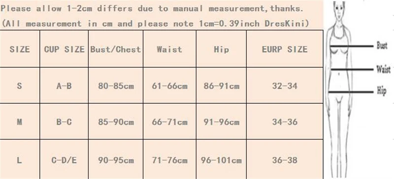 Размер L: C-D чашки, обхват груди 74-98 см, обхват талии 70-102 см, обхват бедер 78-102 см