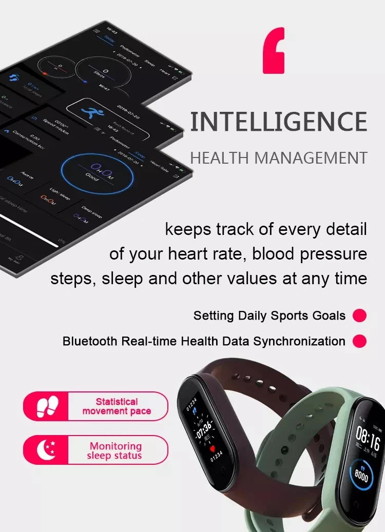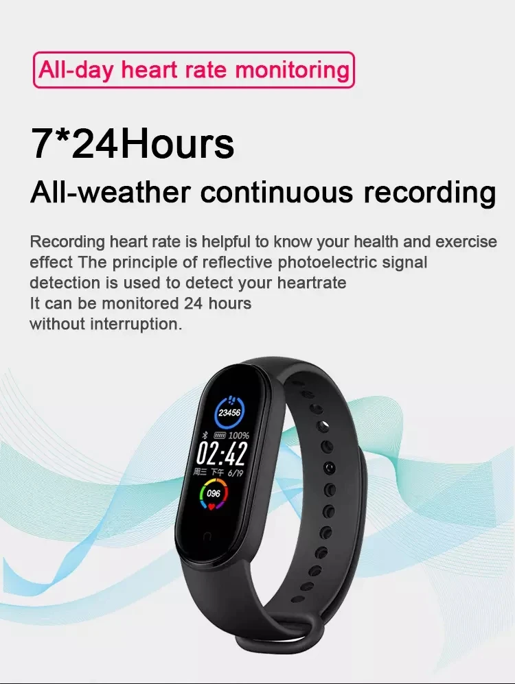 Тип: умный Браслет M5Материал: ТПУ, АБС-пластик, поликарбонатПриложение: Fitpro (язык приложения является необязательным)Системные требования: для Android 4,4/IOS 9,0 или выше* 0,96 дюймовый цветной экран, одноточечная сенсорная кнопка, прозрачный, чтобы увидеть даже под солнечным светом.* IP65 пыленепроницаемый и водонепроницаемый,* Водонепроницаемость: IP65, можно мыть руки, носить под дождем, но не носить его во время плавания или ванны.* Встроенный большой аккумулятор, сверхдлительный режим ожидания до 7 дней, работает в течение 3-5 дней, быстрая зарядка в течение 2 часов (зарядка через USB, usb-кабель входит в комплект).* Браслет сменный.Язык:Push информация: Поддержка всех языковЯзыки смарт-браслета: английский, китайскийФункции:* Управление музыкой, Погода, настройки Dail* Отслеживание активности на весь день: шаги, сожженные калории, пробег.* Мониторинг пульса, кровяного давления и кислорода в крови* Мониторинг сна (время сна, качество сна)* Спортивный режим: бег, сидение, скакалка* Интеллектуальное напоминание: напоминание о звонке, информация push, напоминание о сидячем положении* Напоминание о сообщении: сообщение в Твиттере, сообщение в Whatsapp, сообщение в Facebook, сообщение в Instagram, SMS* Дополнительные функции: Поиск браслета, напоминание о тревоге, удаленная камера, поднимите руку, чтобы осветить,Посылка включает в себя:Умные часы-1 шт.1 х USB кабель зарядного устройства1 x Руководство пользователяПримечания:
