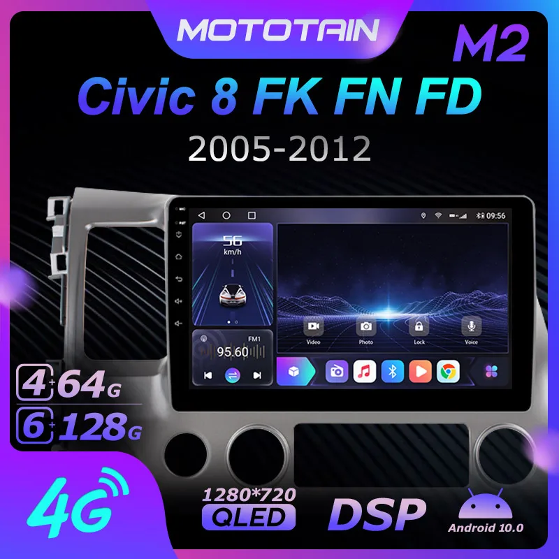 Автомагнитола Mototain 2 Din для Honda Civic 8 FK FN FD 2005 - 2012 Android 10,0 мультимедиа 4G LTE 6G 128G