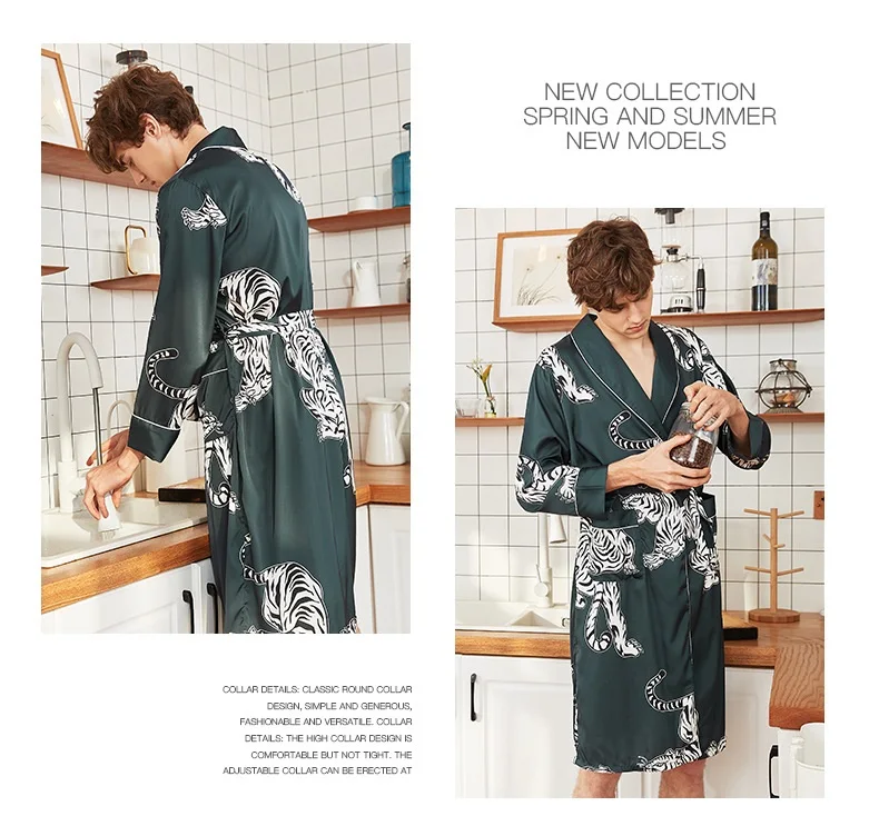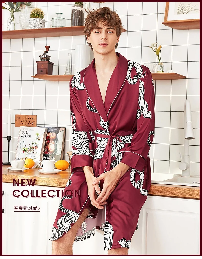 Ночная рубашка из ледяного шелка с длинными рукавами для мужчин, весналето, халат с длинным кардиганом и принтом для домашней одежды