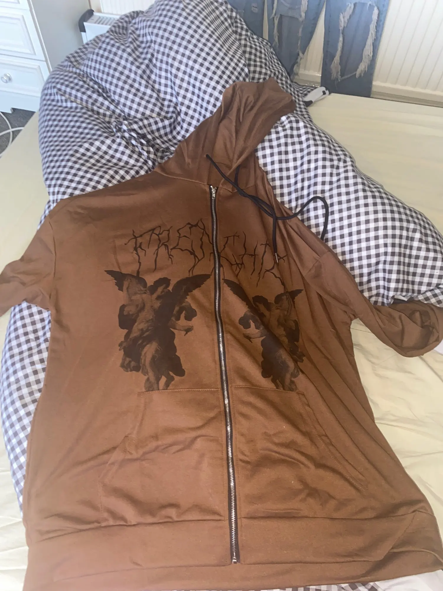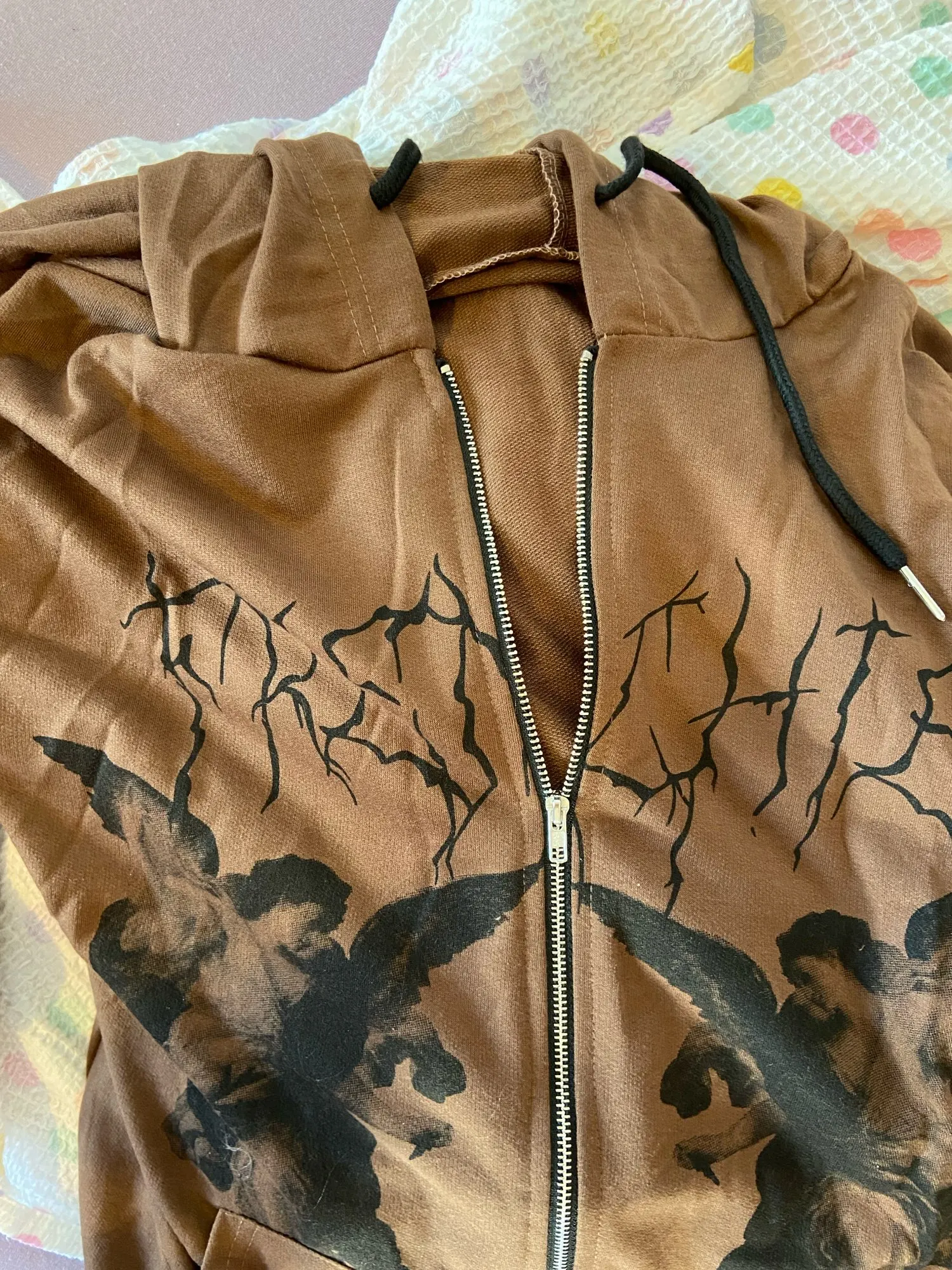 кофта очень тонкая, и просвечивает, торчат нитки, но принт как на фото Шла 1,5 месяца