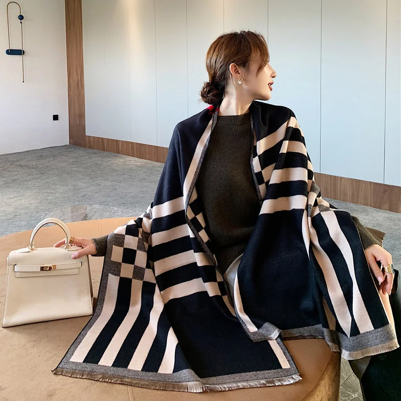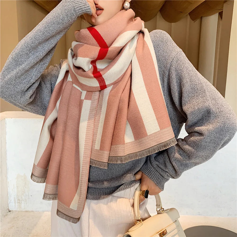 Роскошный кашемировый шарф, женский зимний брендовый полосатый клетчатый черный розовый Теплый пашминовый шарф, женские шарфы, палантины