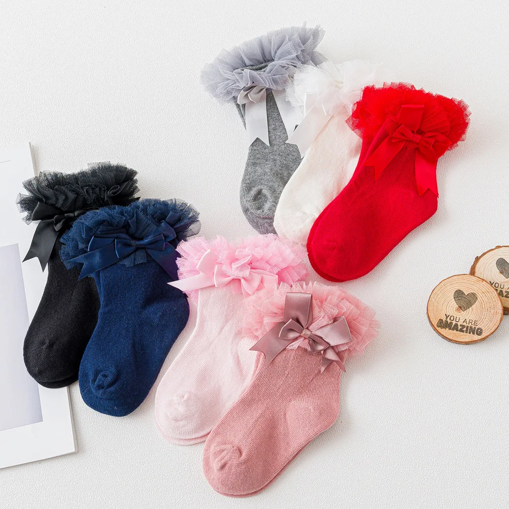 Носки для девочек, кружевное платье принцессы с бантиком для малень...