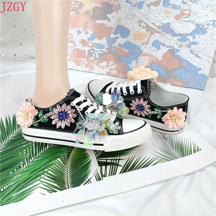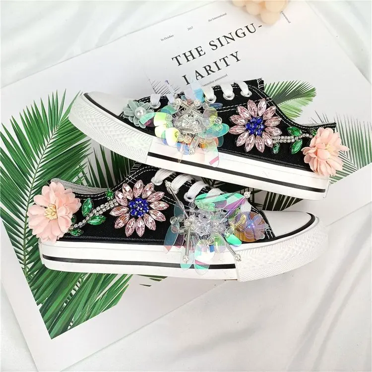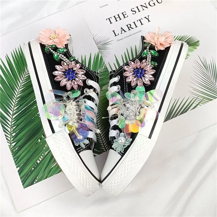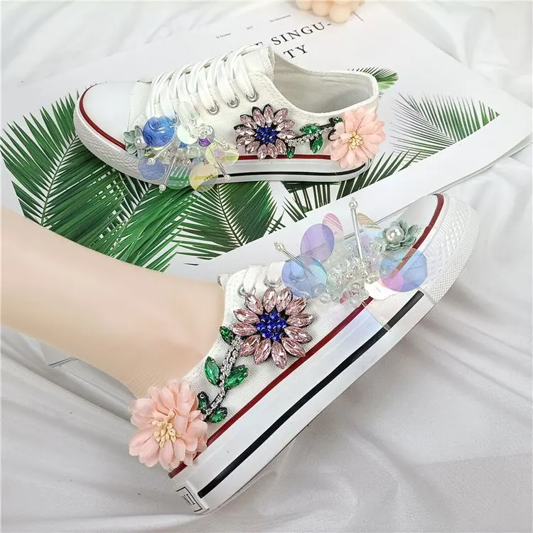 Кеды женские, повседневная холщовая обувь, 3D блестки, плоская подошва, ручная работа, белые