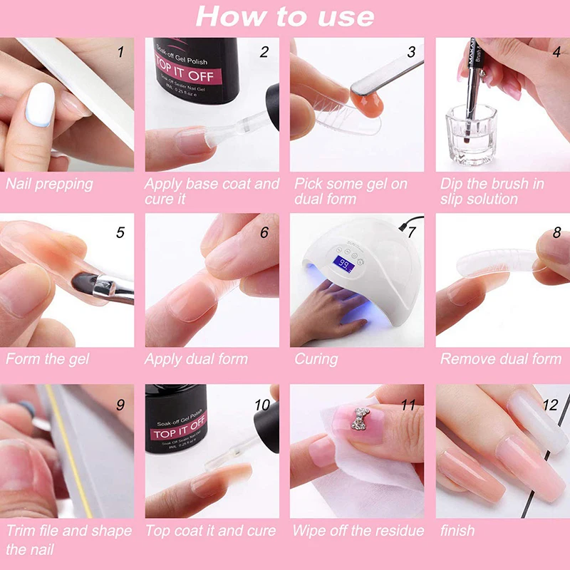 1. С помощью губки для ногтей, буфера для полировки внутри и кромкой.2. Нанесите тонкое Базовое покрытие, светодиодный светильник 120s на 6 Вт Светодиодный светильник (более мощная лампа будет использовать меньше времени).3. Выберите подходящую двойную форму в соответствии с размером настоящего ногтя.4. Нанесите полигель на формы ногтей ручкой для дизайна ногтей с раствором для скольжения, чтобы сделать гель гладким.5. Вставьте его в ногти и убедитесь, что он полностью разрастается, вылечите его. Лучше использовать зажим для фиксации.6. Отклеивайте двойные формы, обрежьте форму и отполируйте ногти.7. Нанесите верхнее покрытие и закрепите его под УФ/светодиодной лампой.8. Дизайн ногтей с вашими удовлетворенными узорами.