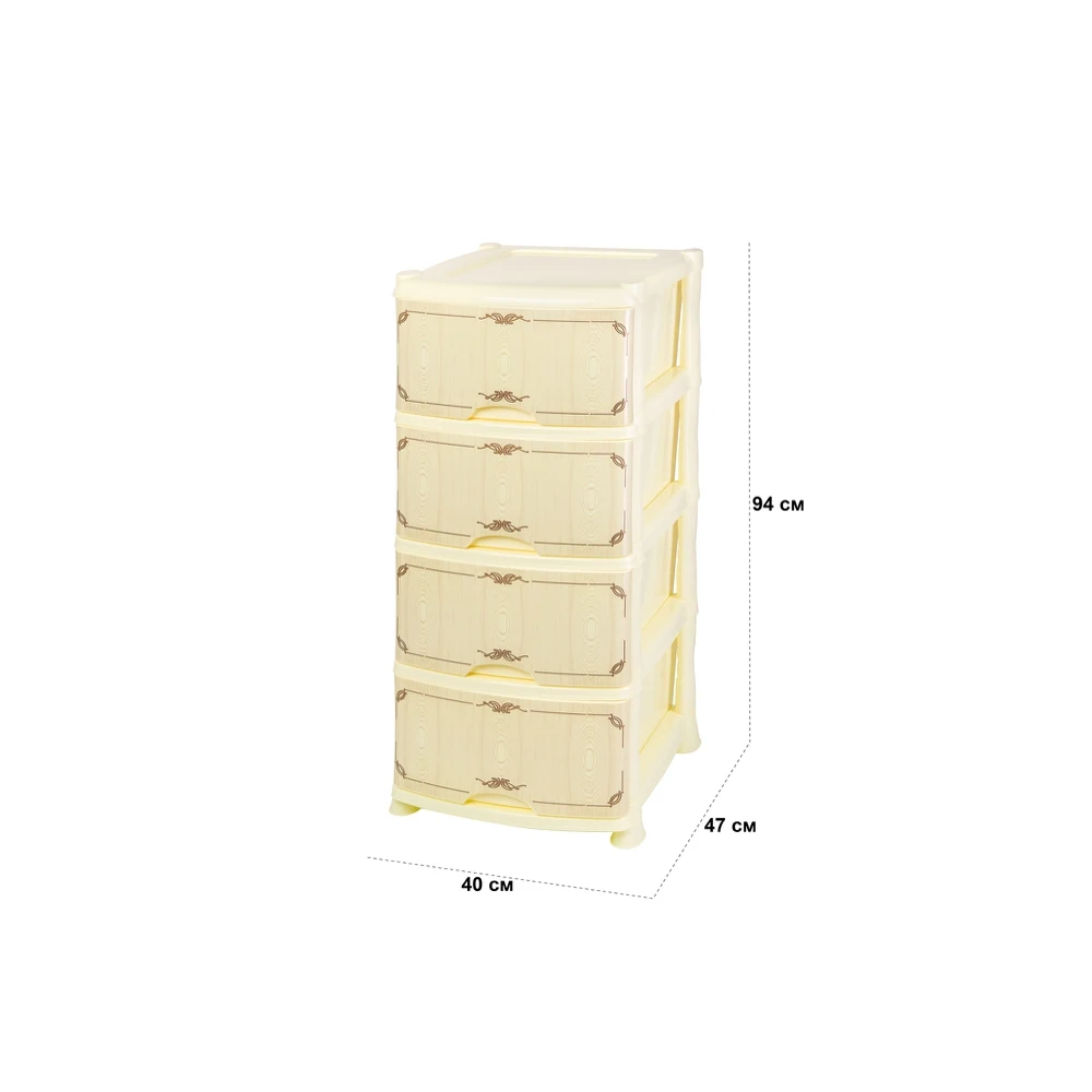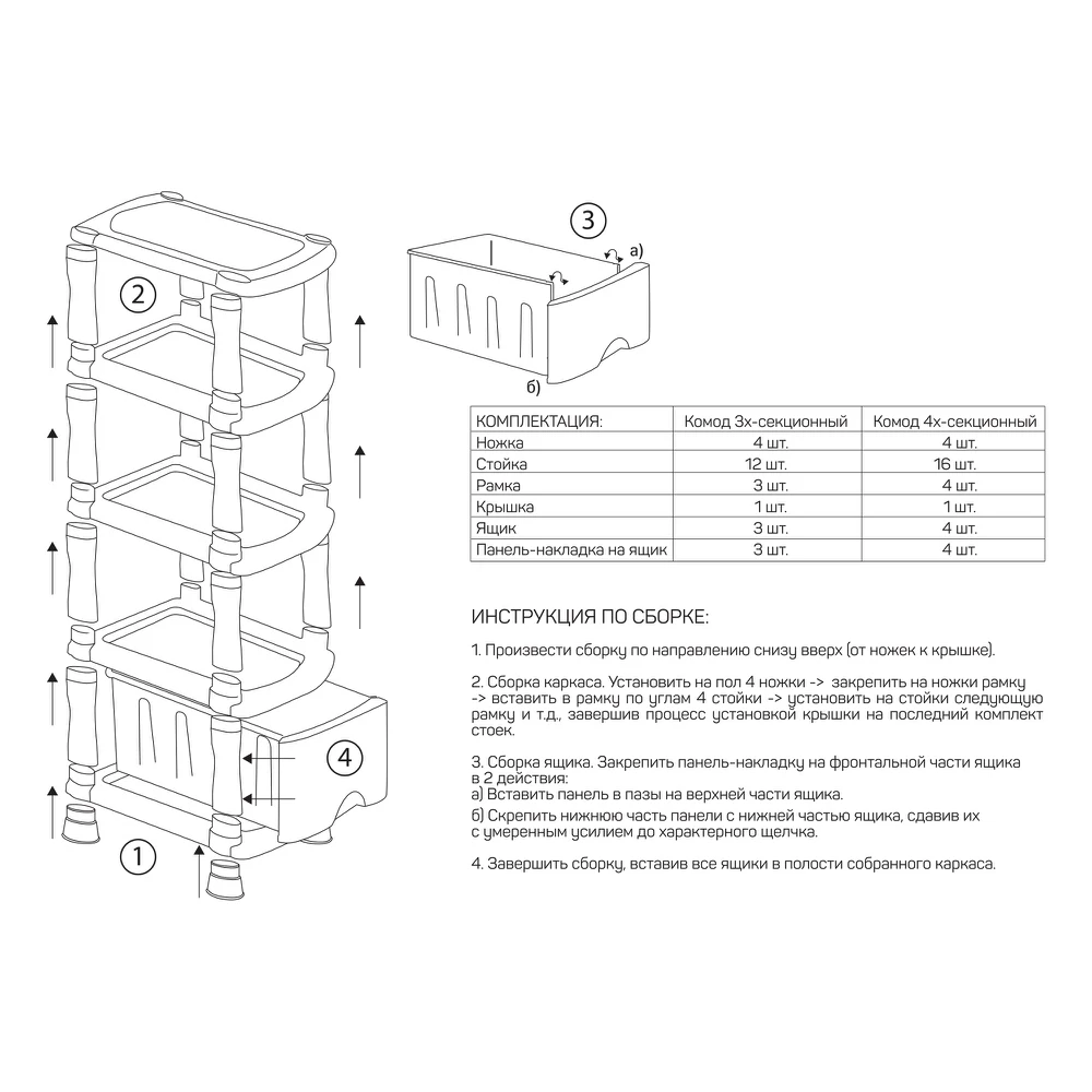 Комод из пищевого пластика с четырьмя выдвижными ящиками предназначен для хранения вещей и продуктов питания и гармонично впишется в интерьер любой комнаты. Легкий и вместительный комод поможет обеспечить порядок, избавит от разбросанных игрушек или одежды, убережет продукты от пыли и заветривания. Передние панели комода декорированы по технологии IML (вплавляемая этикетка) для создания индивидуального стиля. Не рекомендуется размещение пластикового комода вблизи батарей центрального отопления и электрических обогревателей.