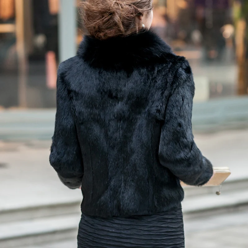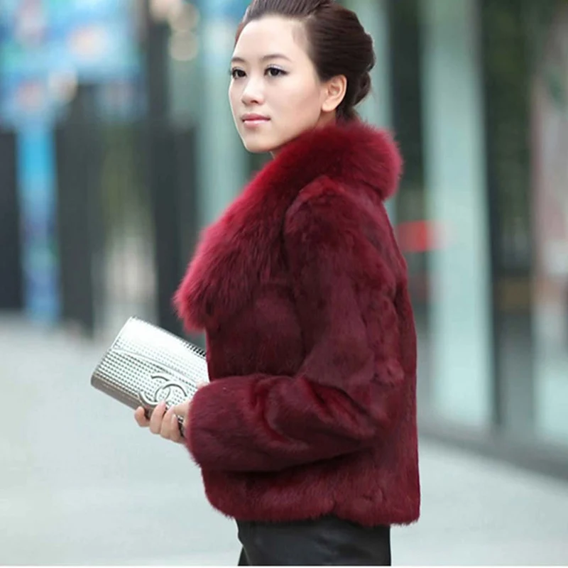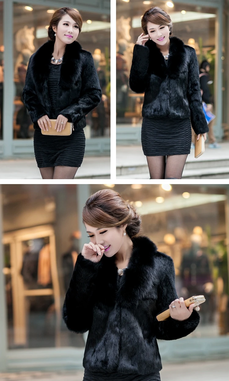 Женское короткое пальто из искусственного кроличьего меха, с воротником из лисьего меха