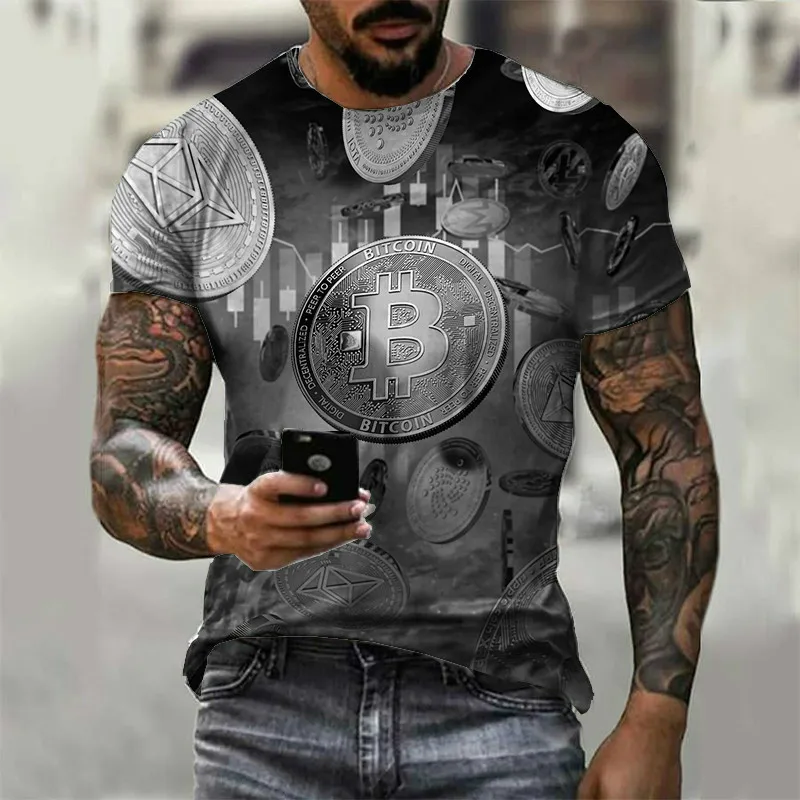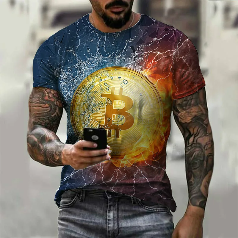 Футболка мужская с круглым вырезом, свободная рубашка с коротким рукавом, с 3D принтом биткоина, уличная одежда с надписью, лето 2021