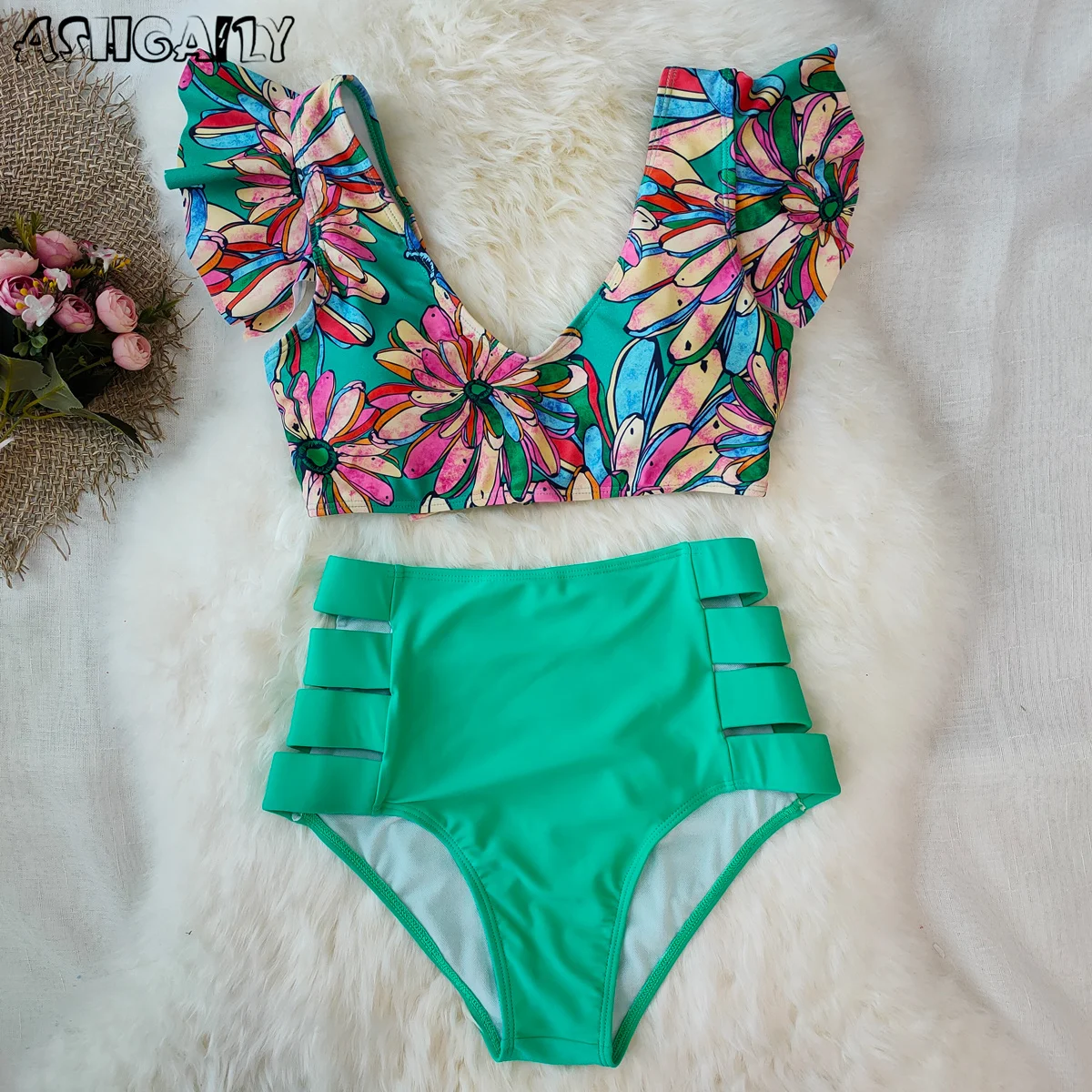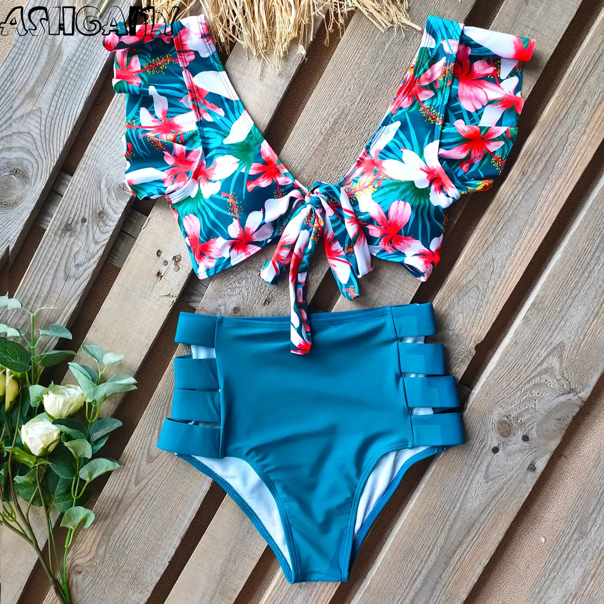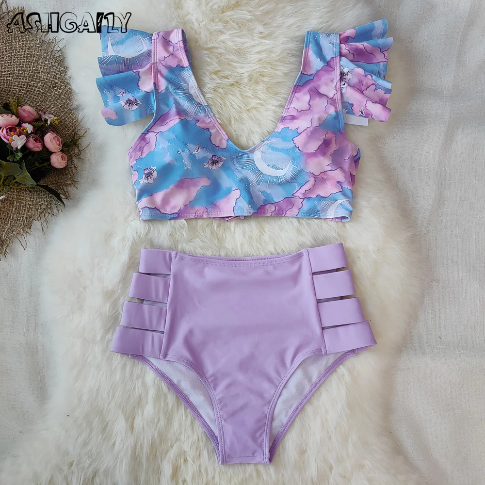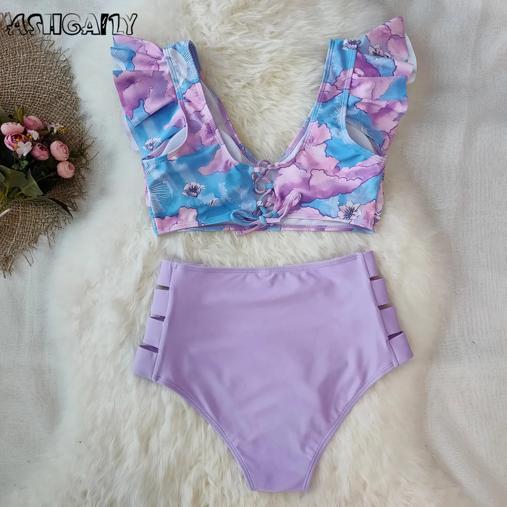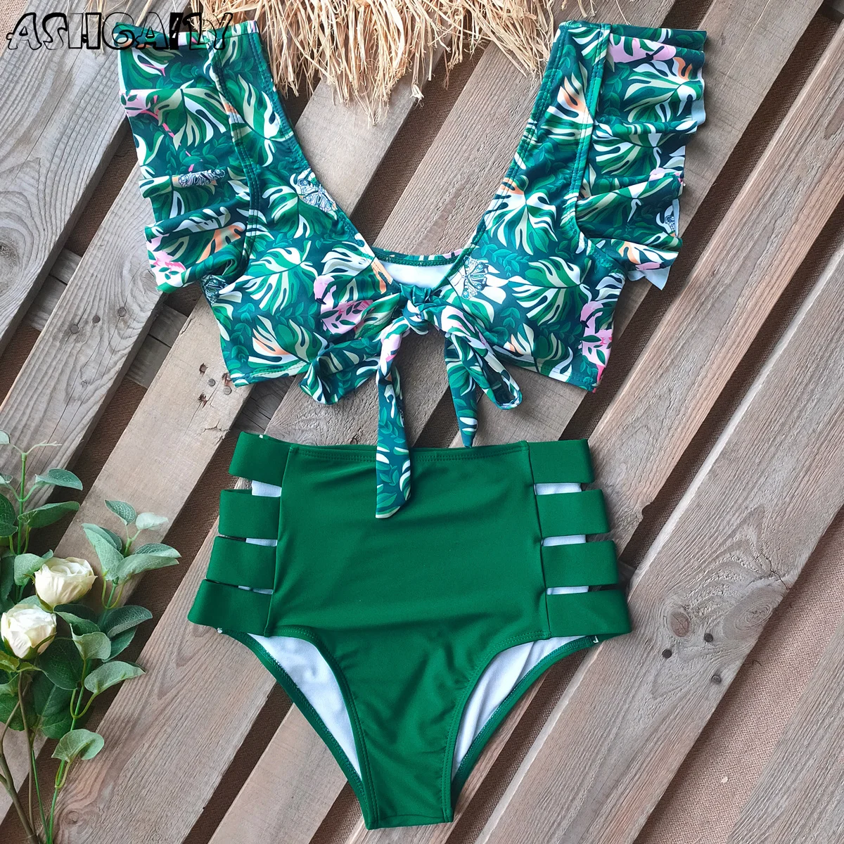 2021 женский купальник с принтом, бикини с высокой талией и оборками, женский купальный костюм, пляжная одежда, летнее женское бикини