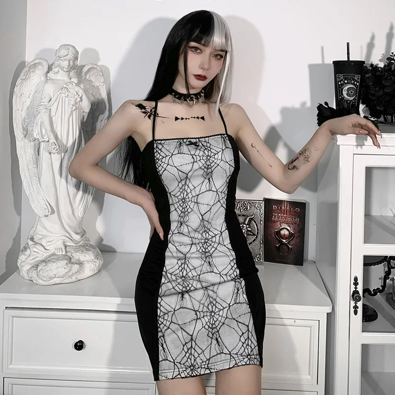 Женское платье с открытой спиной, Красное или белое платье-мини без рукавов с принтом паутины, в готическом стиле, лето 2022
